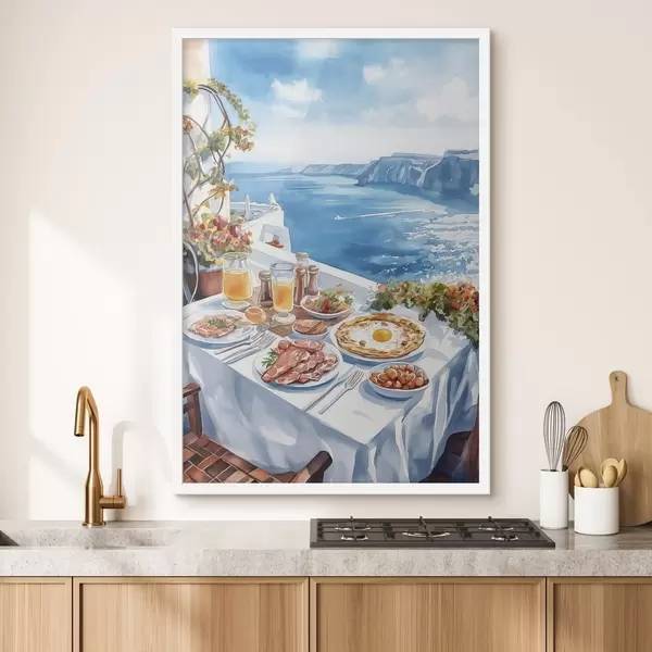 Plakat Kaunis romantiline hommikusöök Kreekas, meri, akvarellistiilis f42455