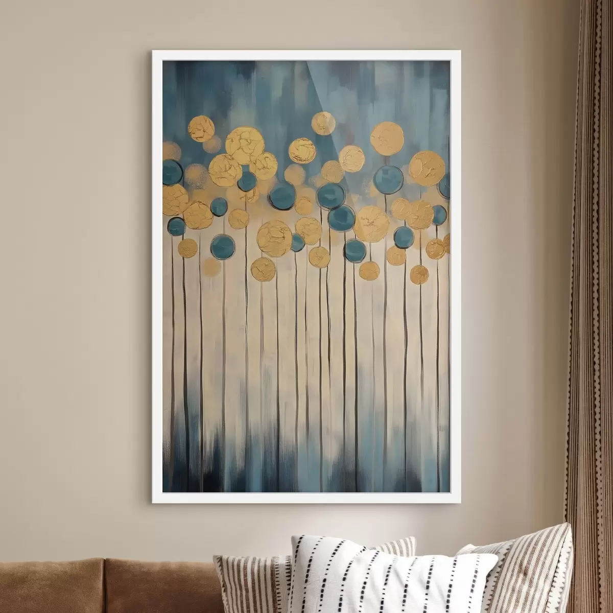 Plakat Dekoratiivne abstraktsioon ümmarguste elementidega sinisel ja beežil taustal f42476