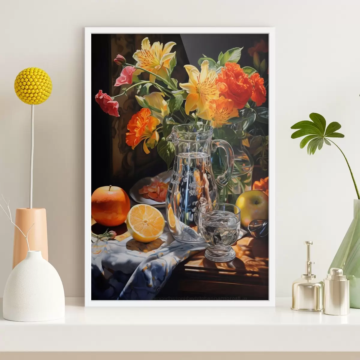 Poster Vaikne vaatepilt, millel on kollastes ja punastes toonides heledate lillede kimp, klaasist kann, tsitrusviljad ja õunad valgustatud laual. Nr f42560