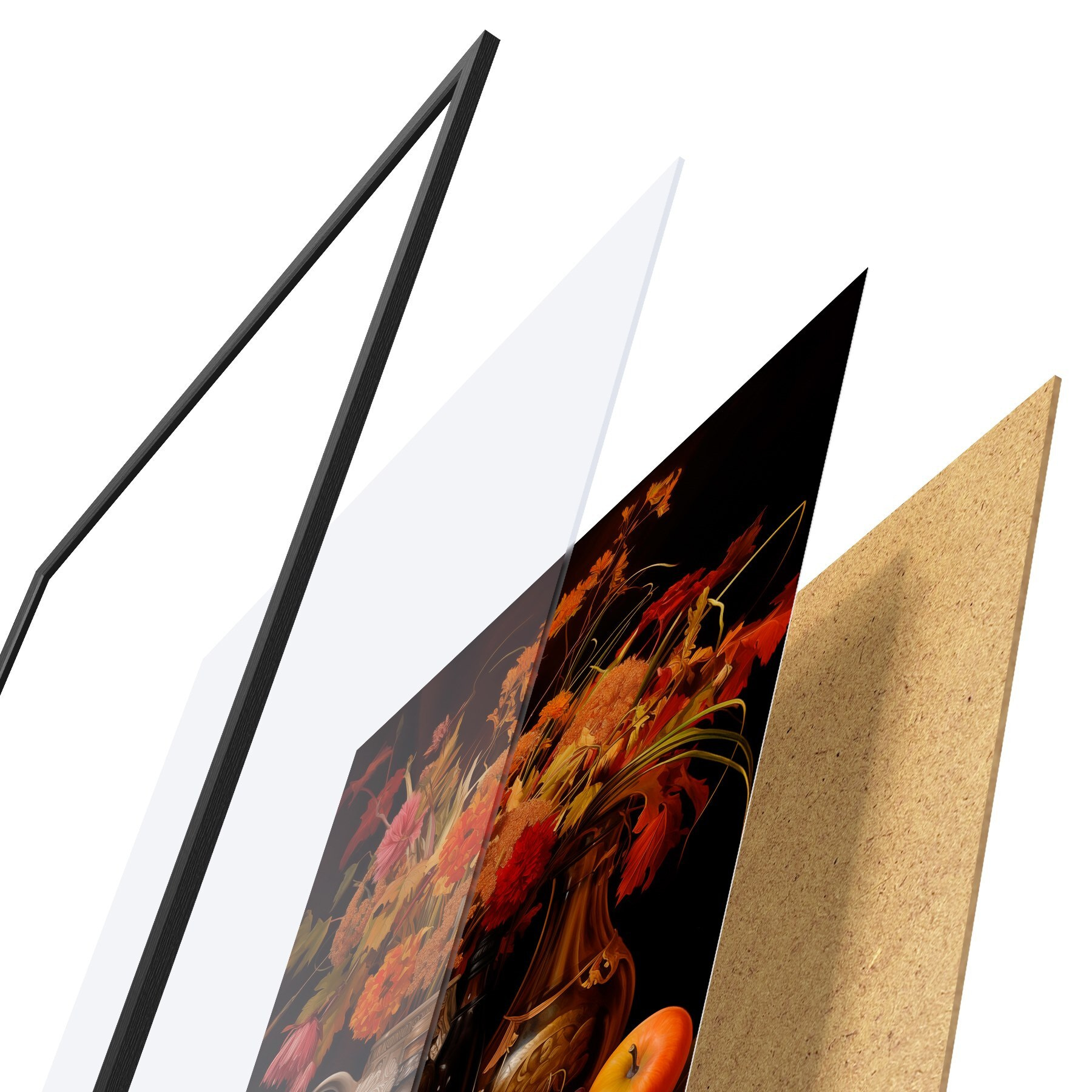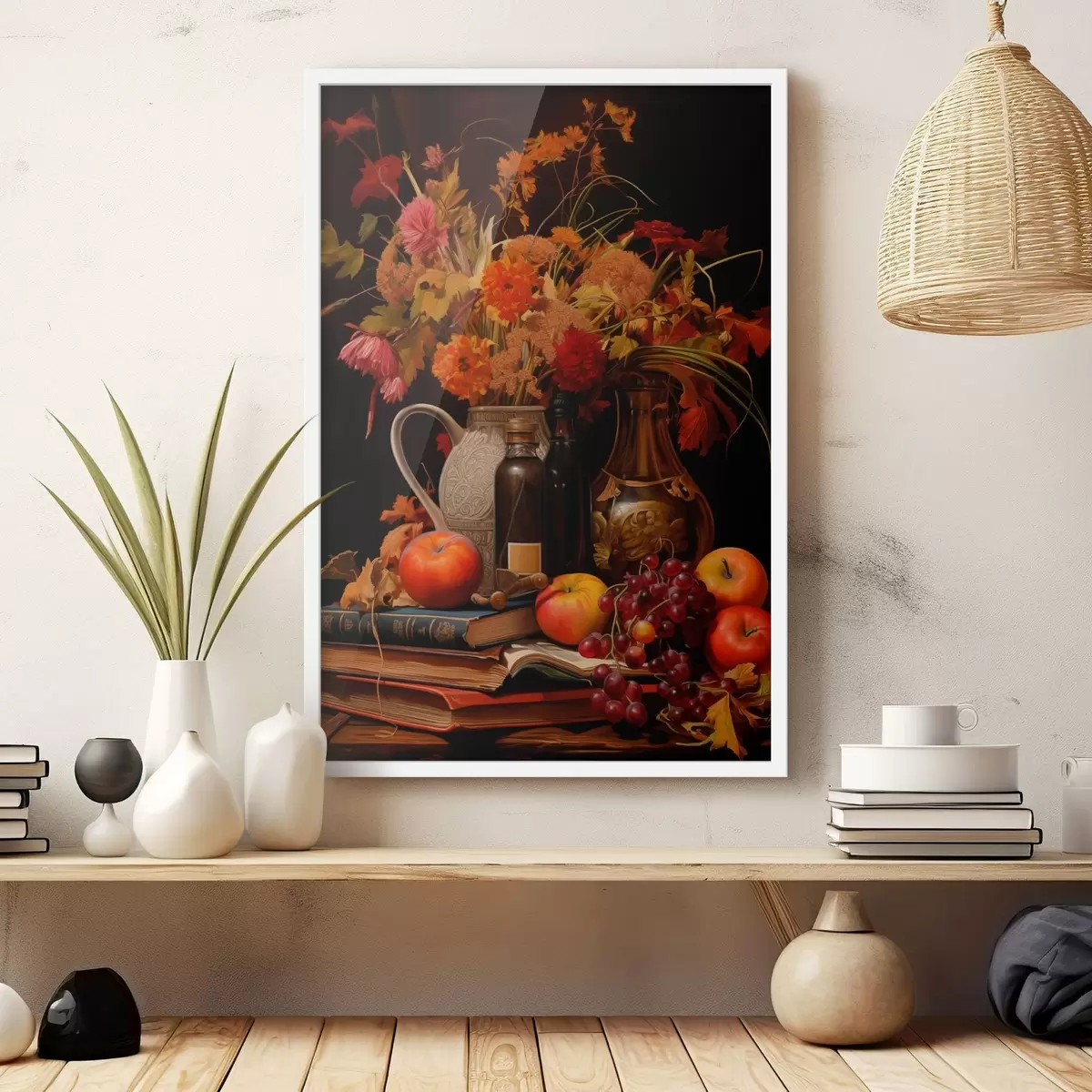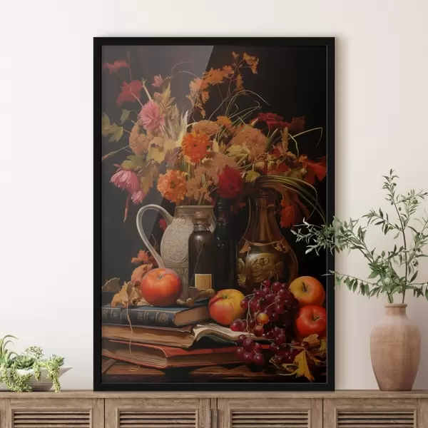 Poster Sügisene vaatepilt, millel on tumedal taustal oranži ja punaste toonidega kimp, õunad, viinamarjad, raamatud ja keraamilised nõud. Nr f42561