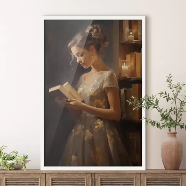 Poster Noor naine elegantses kleidis, kes loeb raamatut atmosfäärilises valguses, mida ümbritsevad raamaturiiulid ja küünalde pehme kuma. Nr f42570