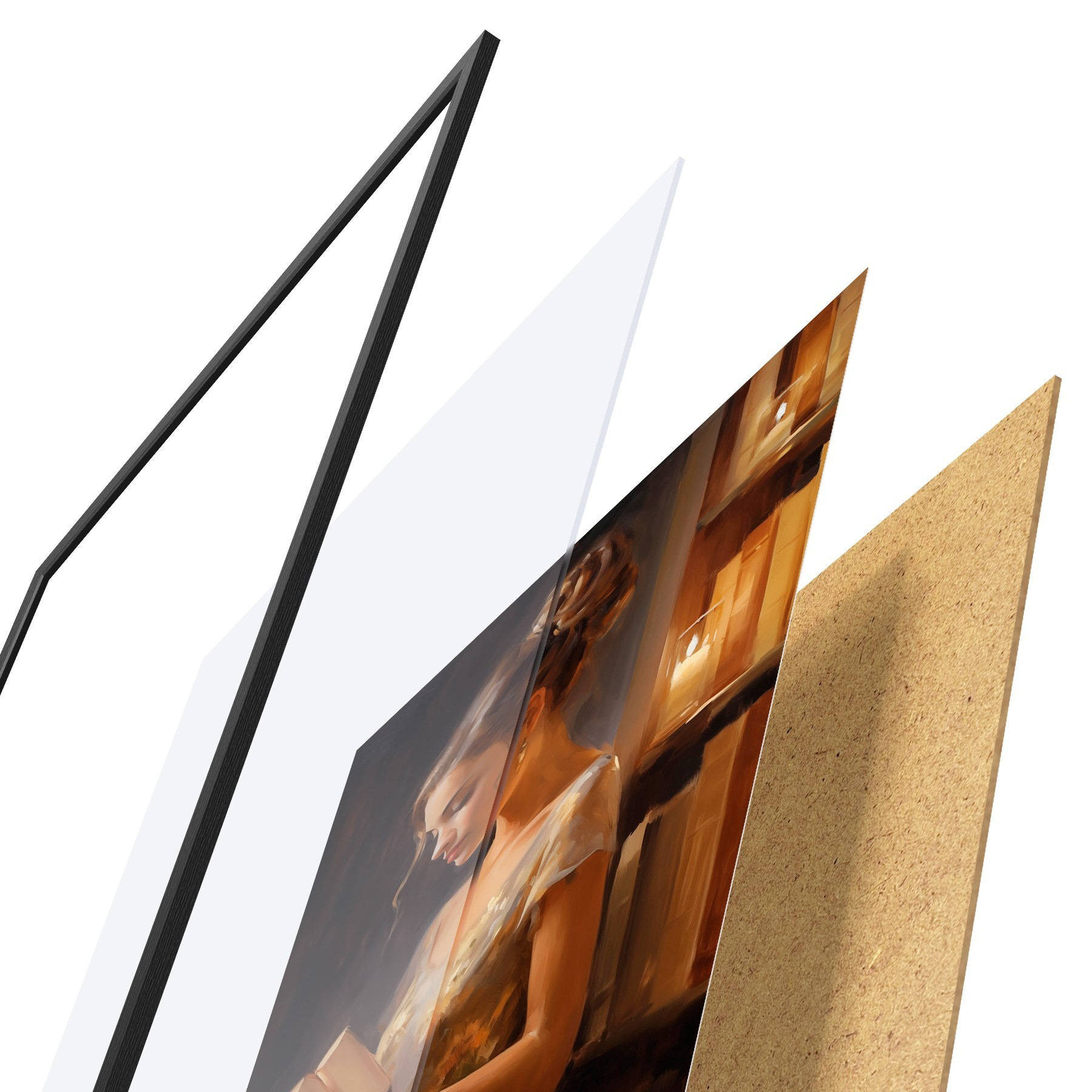 Plakat Noor naine elegantses kleidis, kes loeb raamatut atmosfäärilises valguses, mida ümbritsevad raamaturiiulid ja küünalde pehme kuma. f42570