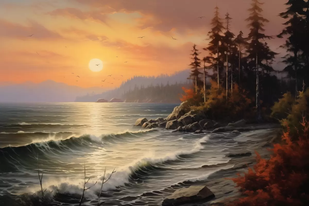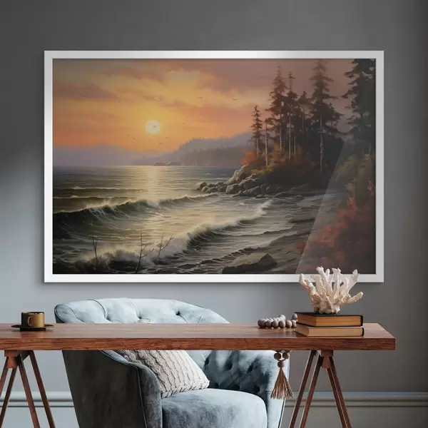 Plakat Päikeseloojang mere ääres koos lainete, männimetsa ja sügisvärvidega esiplaanil. f42571