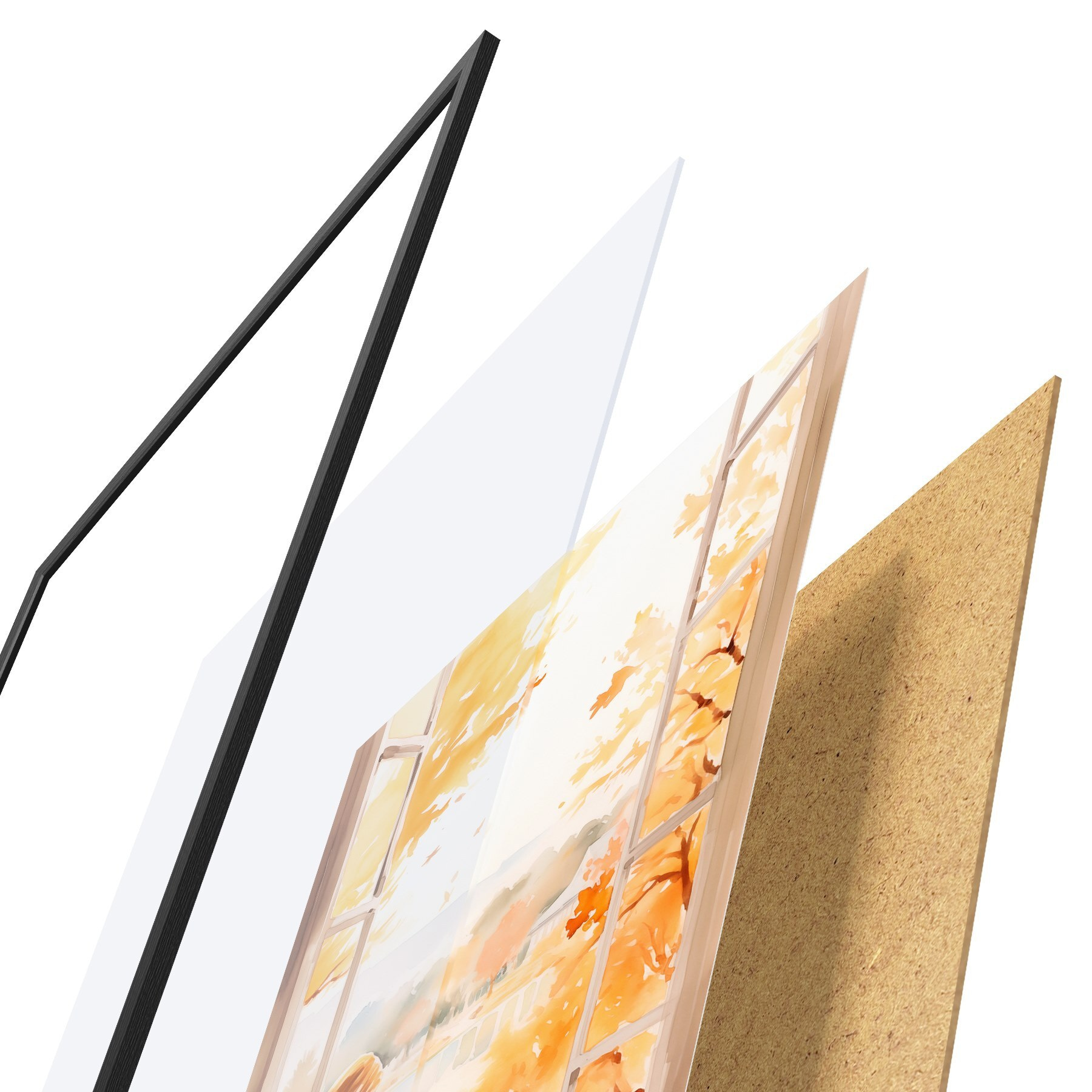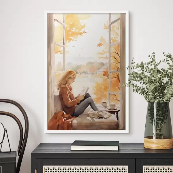 Plakat Tüdruk loeb raamatut avatud akna juures sügiseses maastikus, taustal heledad puud ja lähedal tass teed. f42572