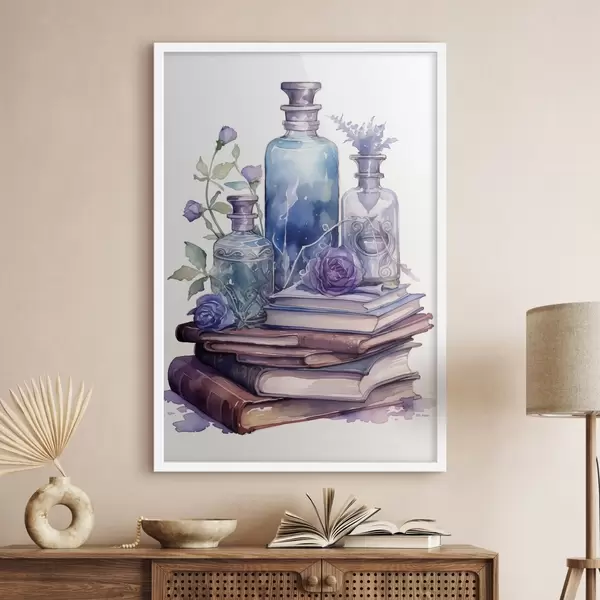 Plakat Natüürmort vanaaegsete raamatute, sinilillatooniliste klaaspudelite ja dekoratiivsete lilledega. f42574