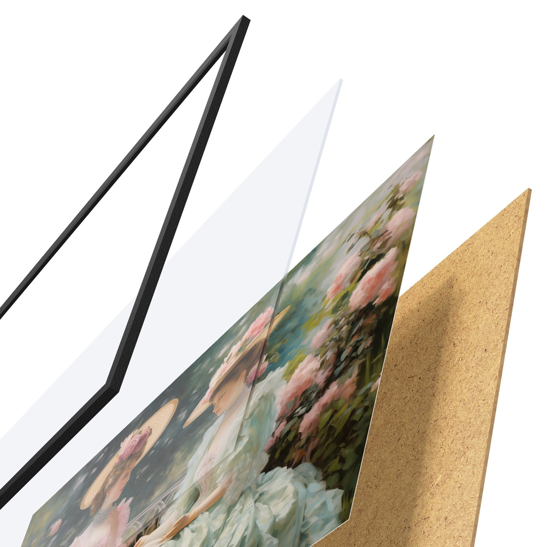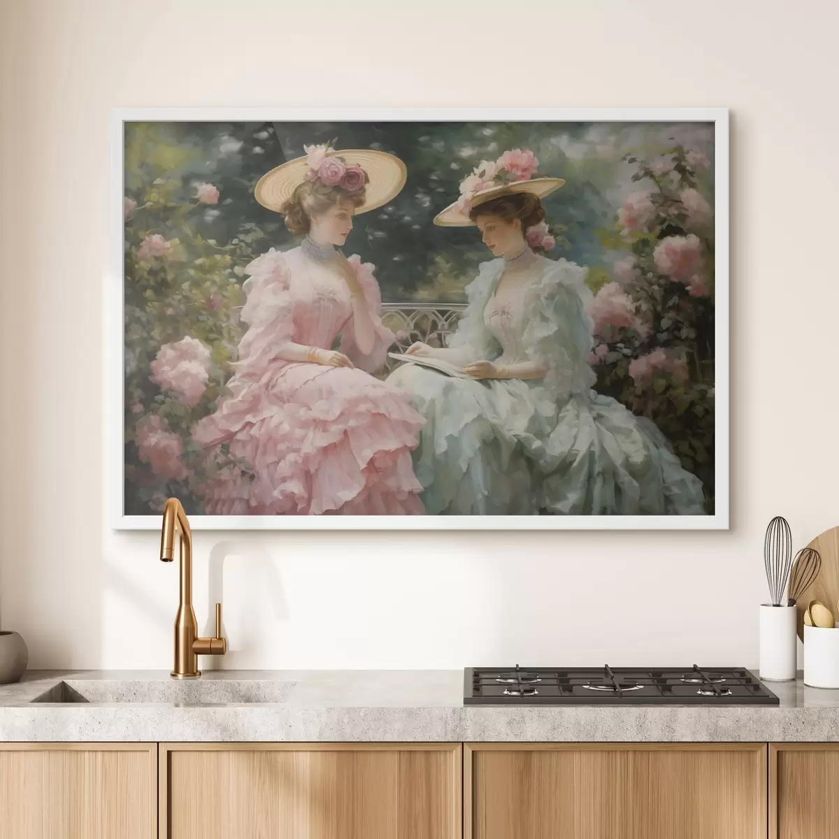 Plakat Kaks pastelsetes kleitides elegantset naist istuvad aias rooside vahel, loevad raamatut ja naudivad rahulikku õhkkonda. f42582