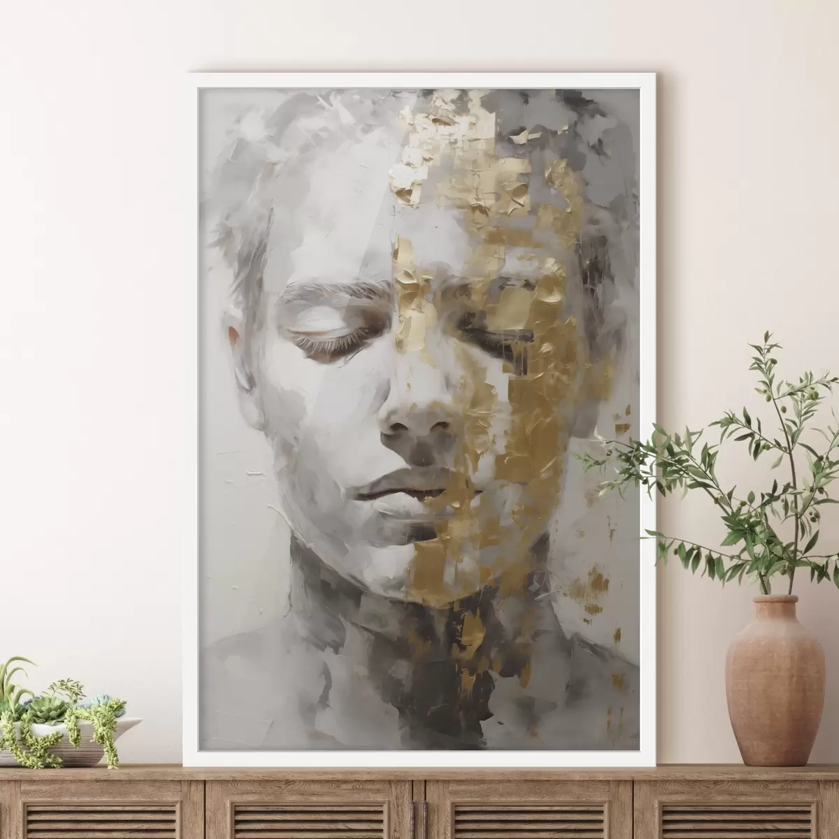 Poster Abstraktne portree suletud silmadega, mis on esitatud heledates toonides ja kontrastsete soojade pintslitõmmetega, mis loovad sügava ja meditatiivse meeleolu. Nr f42624