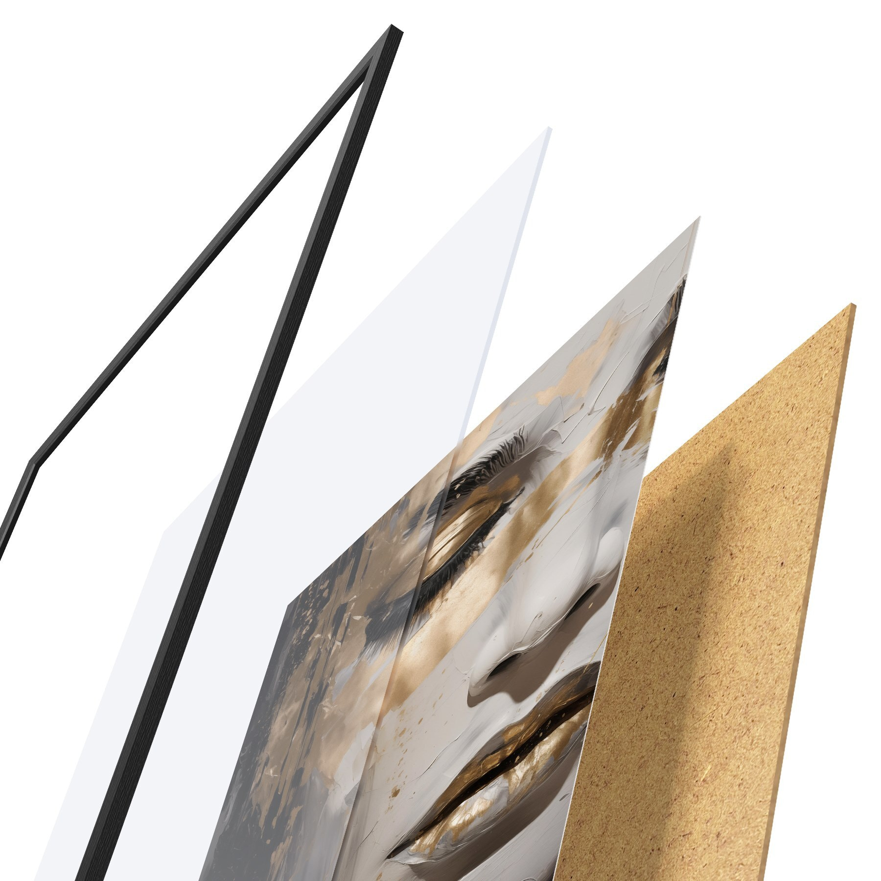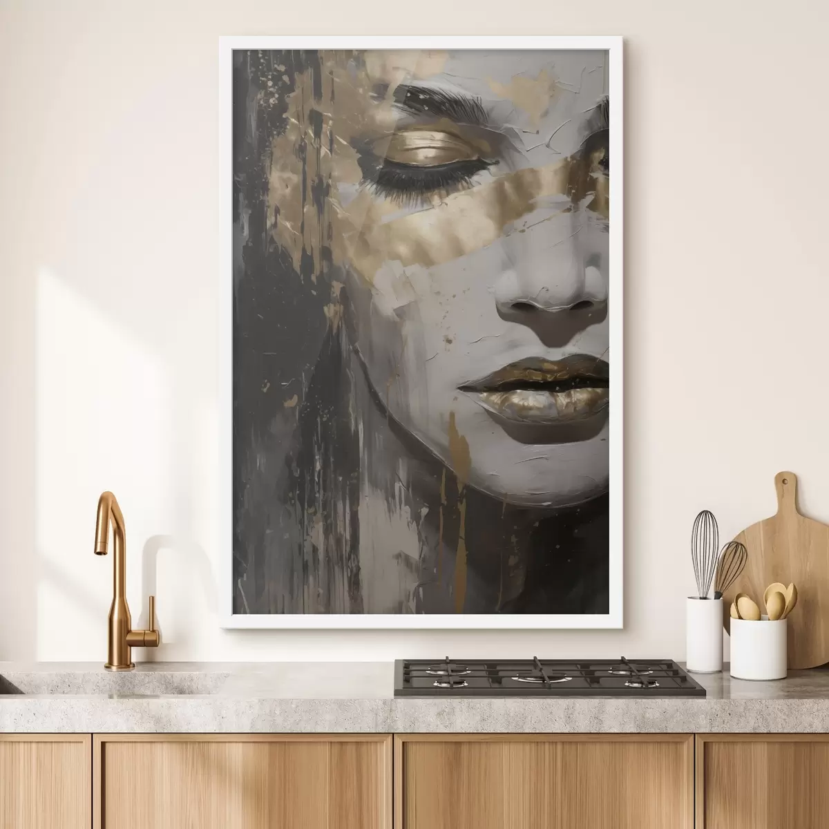 Poster Abstraktne portree naisest, rõhutades suletud silmi ja huuli, mis on teostatud must-valgetes toonides dünaamiliste soojade pintslitõmmetega. Nr f42626