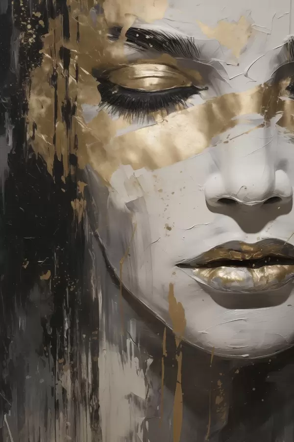 Plakat Abstraktne portree naisest, rõhutades suletud silmi ja huuli, mis on teostatud must-valgetes toonides dünaamiliste soojade pintslitõmmetega. f42626