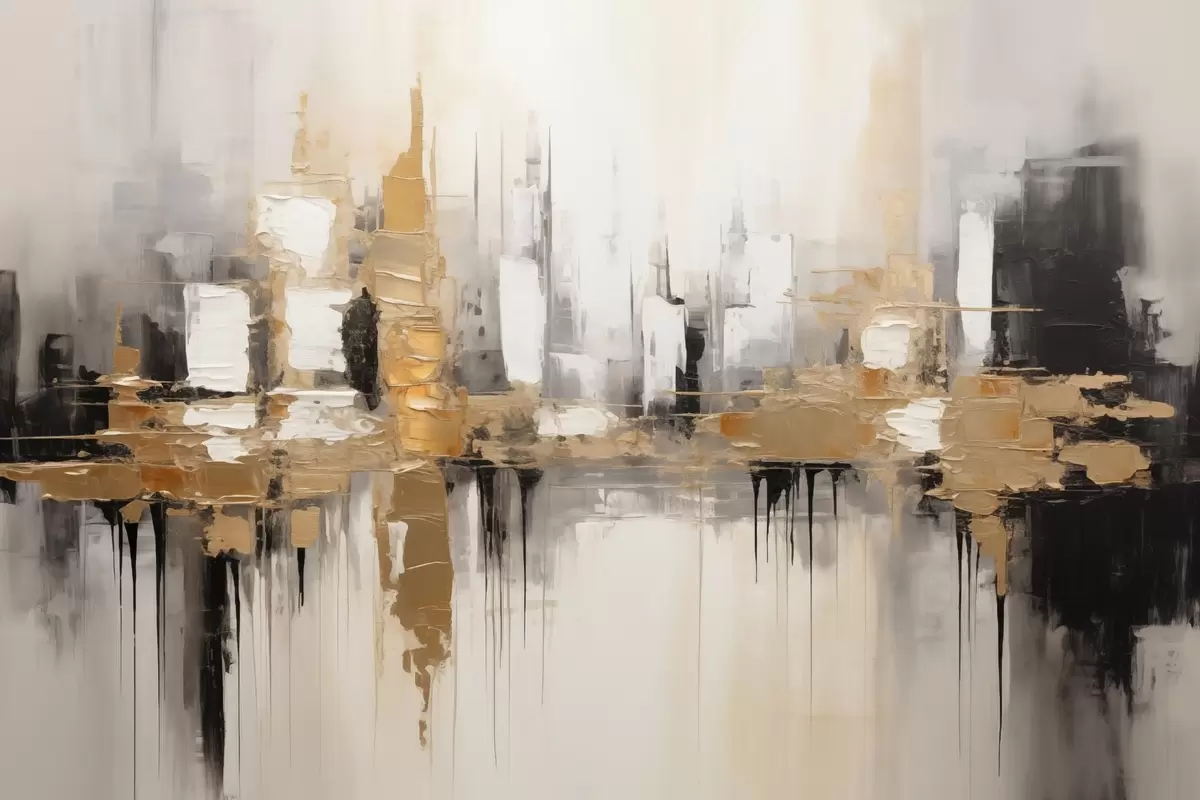 Poster Abstraktne linnapilt hoonete peegeldustega vees, mis on loodud neutraalsetes toonides ja soojade toonide aktsentidega. Nr f42628