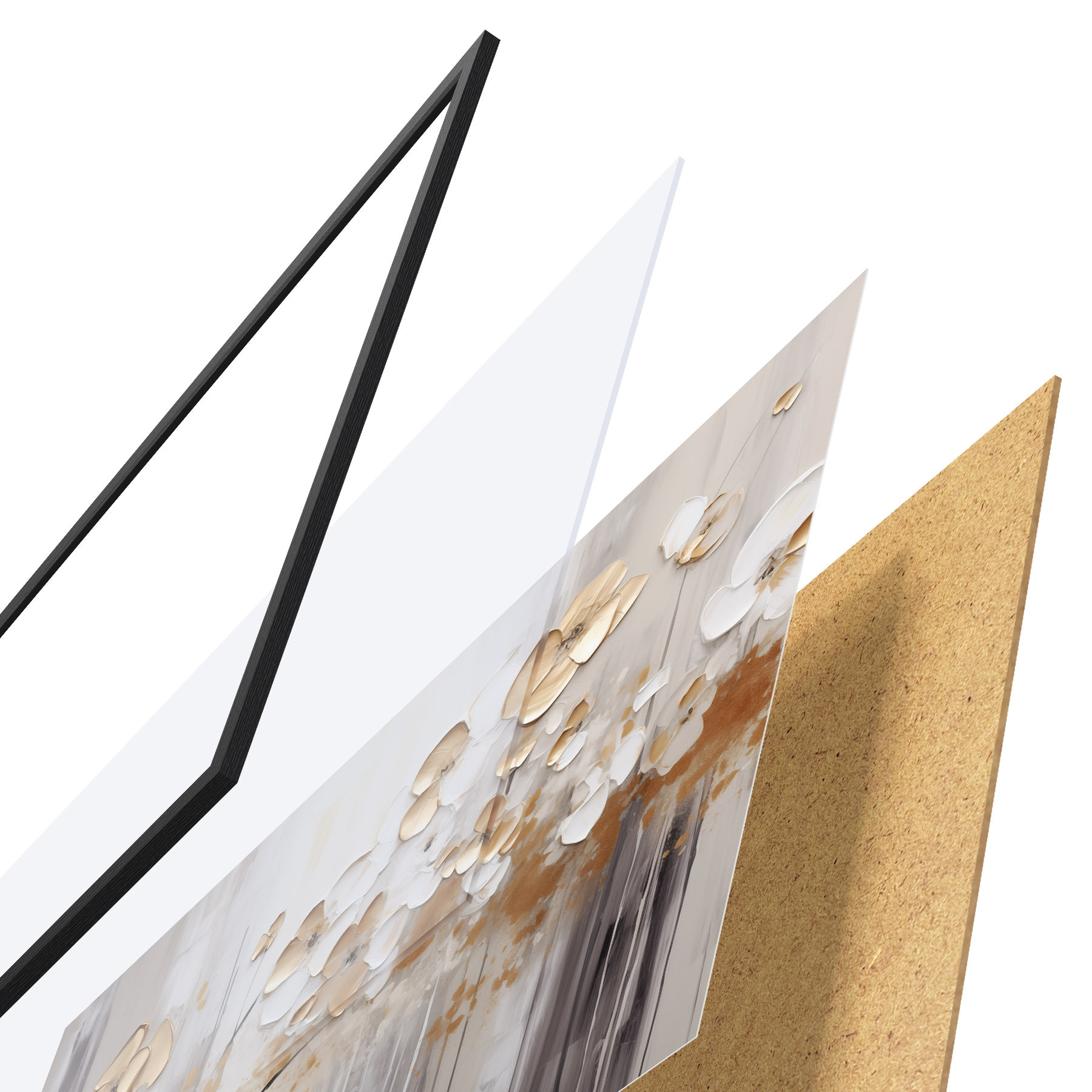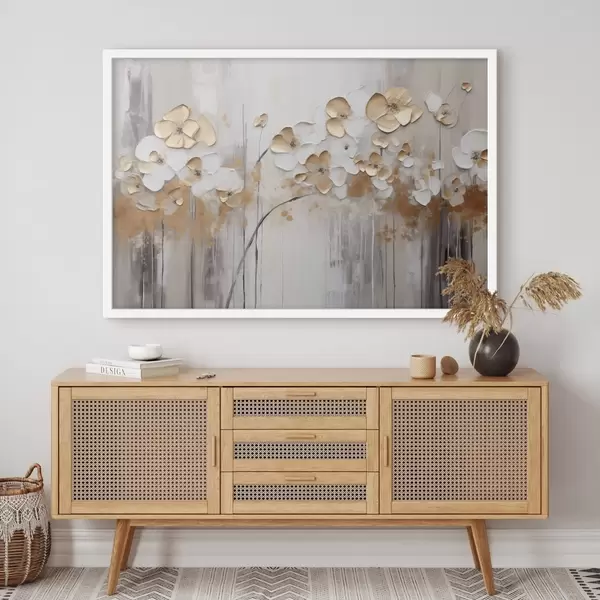 Poster Tekstuursete kroonlehtedega lilled pehmel, summutatud taustal koos abstraktsete värvilaikude ja vertikaalsete joontega Nr f42713