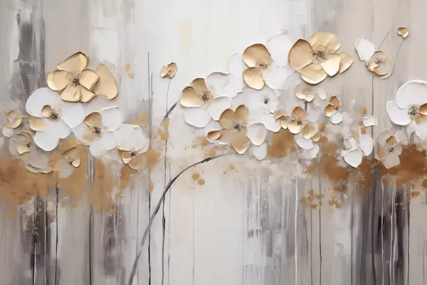 Poster Tekstuursete kroonlehtedega lilled pehmel, summutatud taustal koos abstraktsete värvilaikude ja vertikaalsete joontega Nr f42713