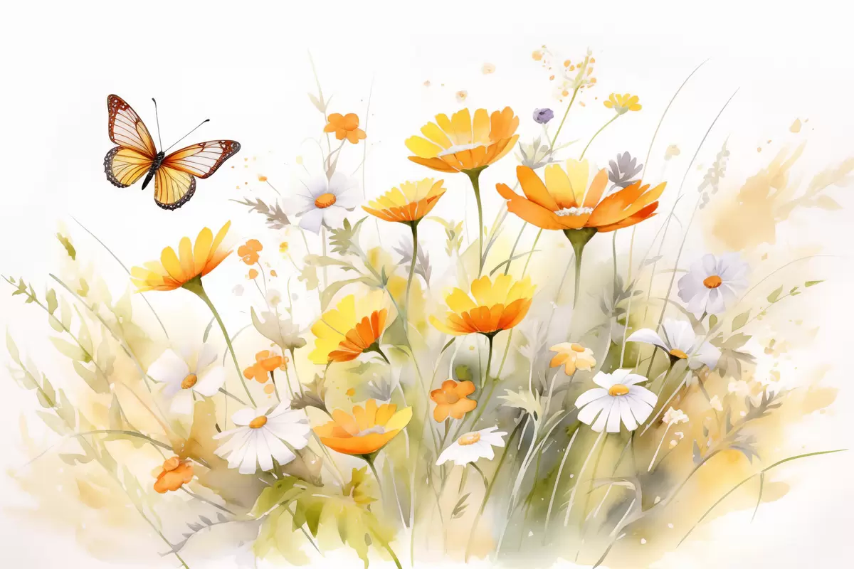 Poster Elavat akvarellilaadset lillevälja, millel on oranžid ja valged päevakübarad, lähedal lehvib liblikas Nr f42714