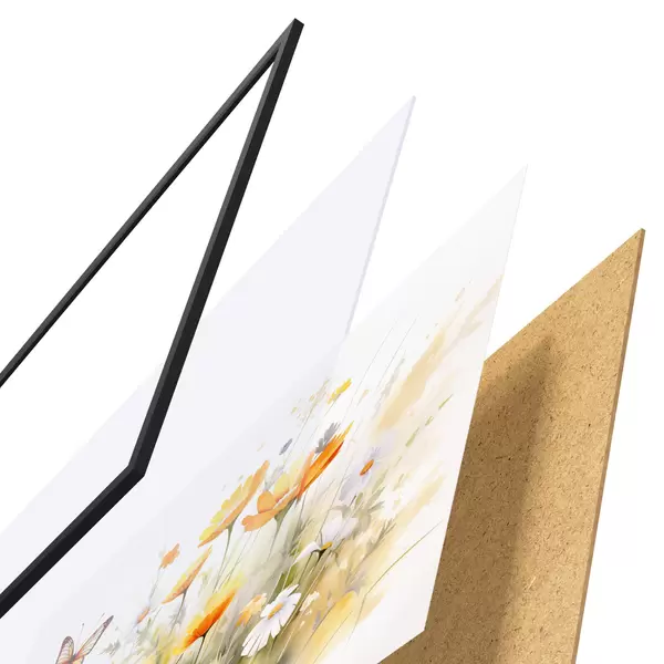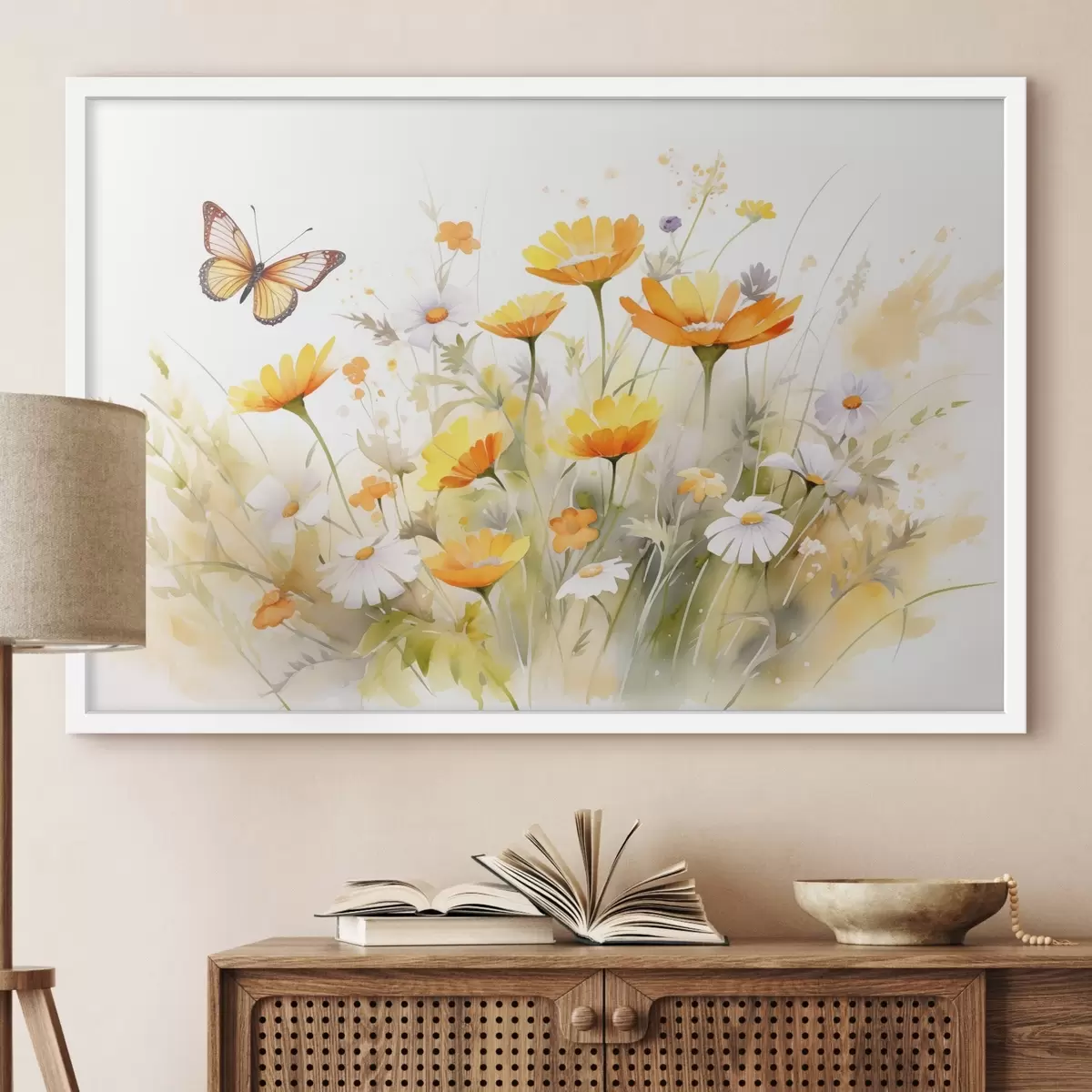Plakat Elavat akvarellilaadset lillevälja, millel on oranžid ja valged päevakübarad, lähedal lehvib liblikas f42714