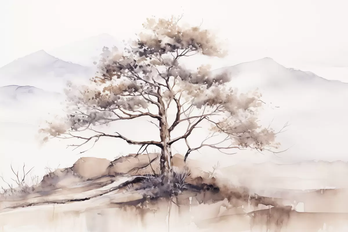 Poster Üksildane puu, mille tüvi on väändunud ja harvaesinevad oksad on asetatud pehmele, vaiksele mägede taustale Nr f42715