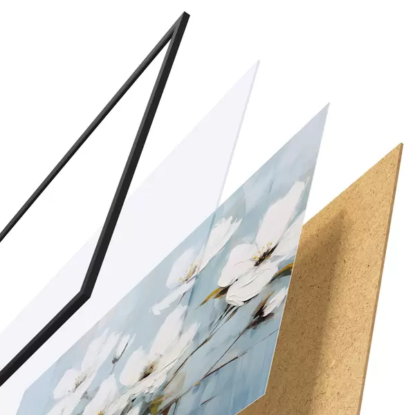 Plakat Valged õrnade kroonlehtede ja roheliste lehtedega lilled helesinisel taustal õlimaali jäljendusega f42719