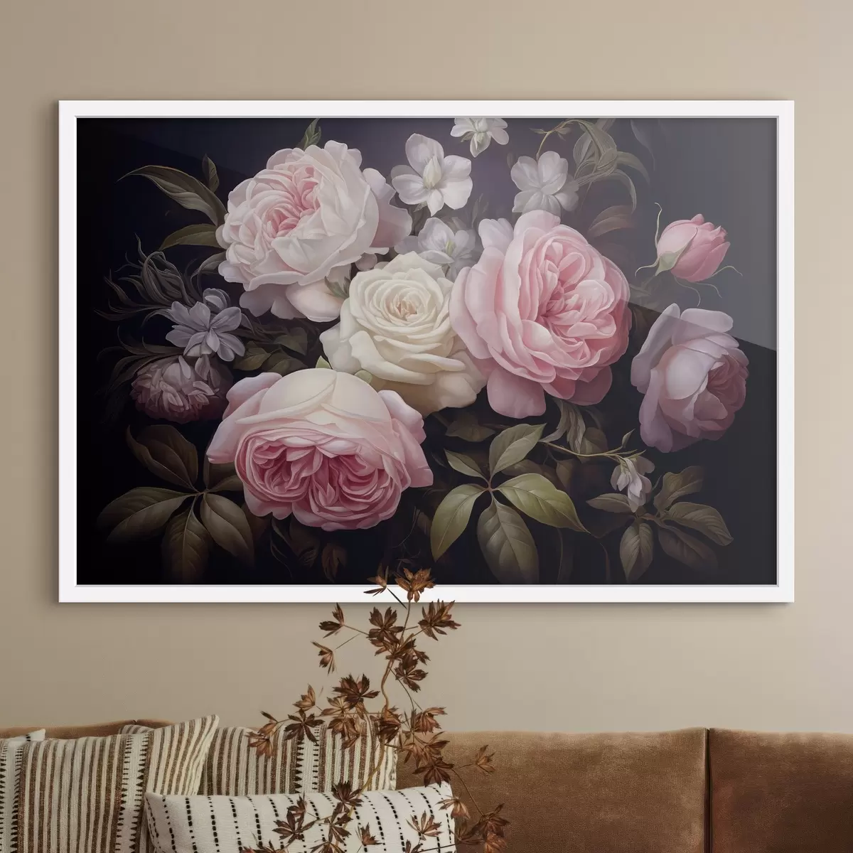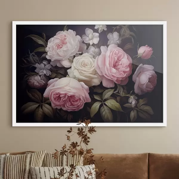 Plakat Roosad ja valged roosid, mis on paigutatud õrnade valgete lillede ja roheliste lehtedega tumedal taustal f42721