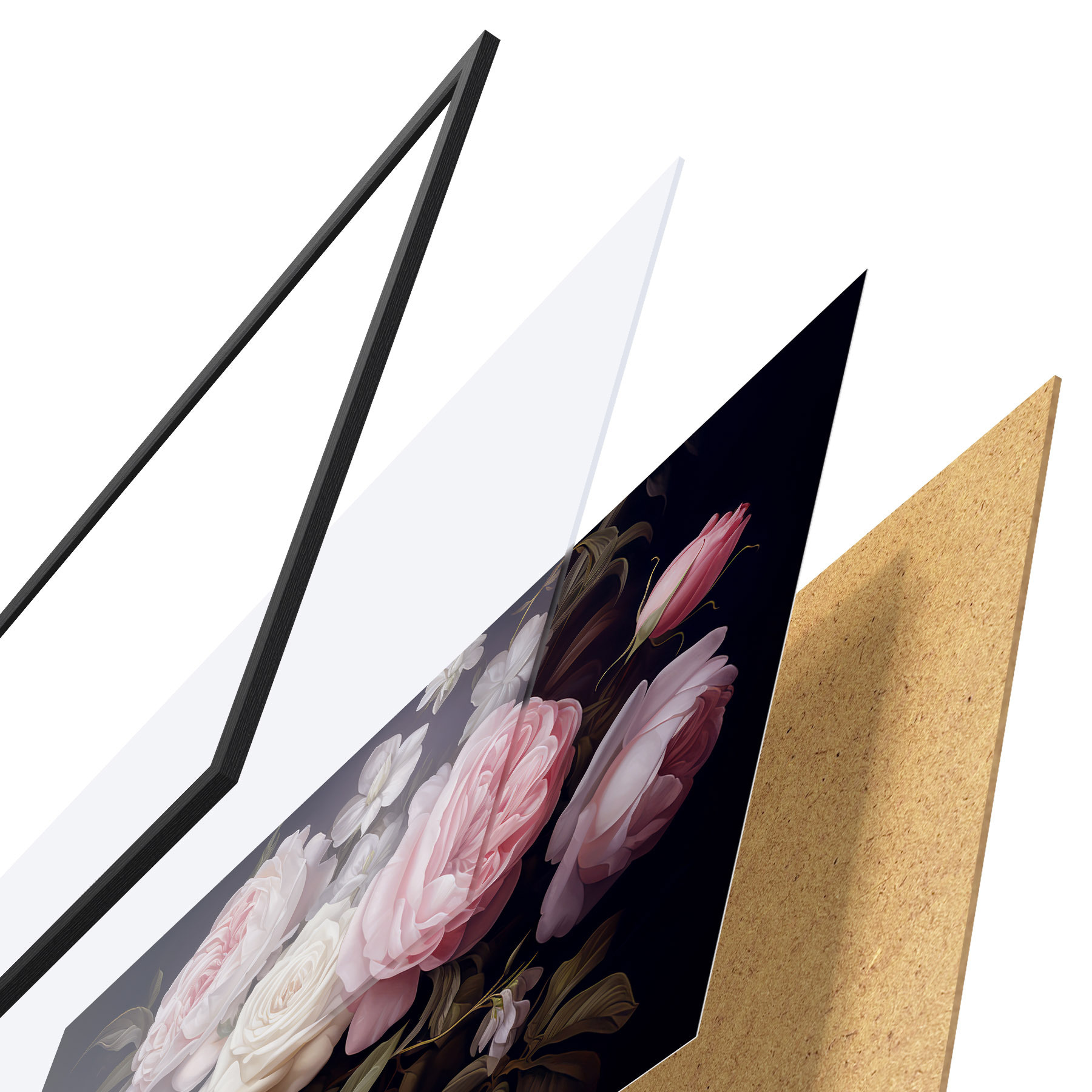 Poster Roosad ja valged roosid, mis on paigutatud õrnade valgete lillede ja roheliste lehtedega tumedal taustal Nr f42721