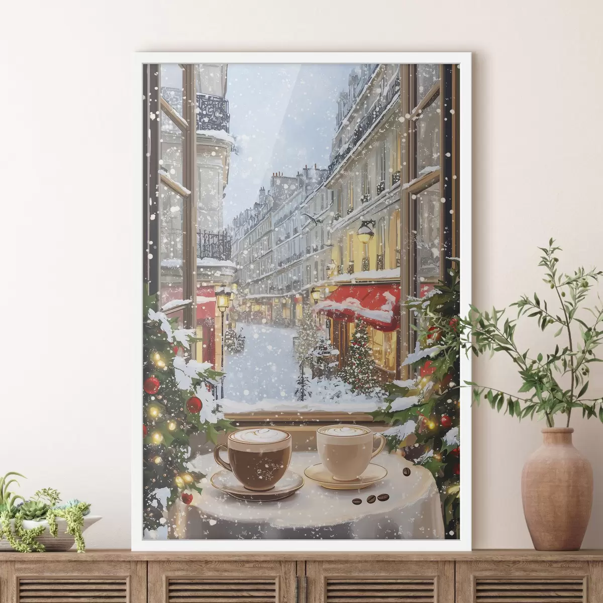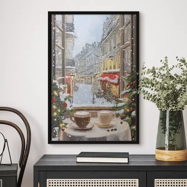 Poster Hubane talvekohvik, kohvitassid, akrüülstiil, vana linnaarhitektuur Nr f42795