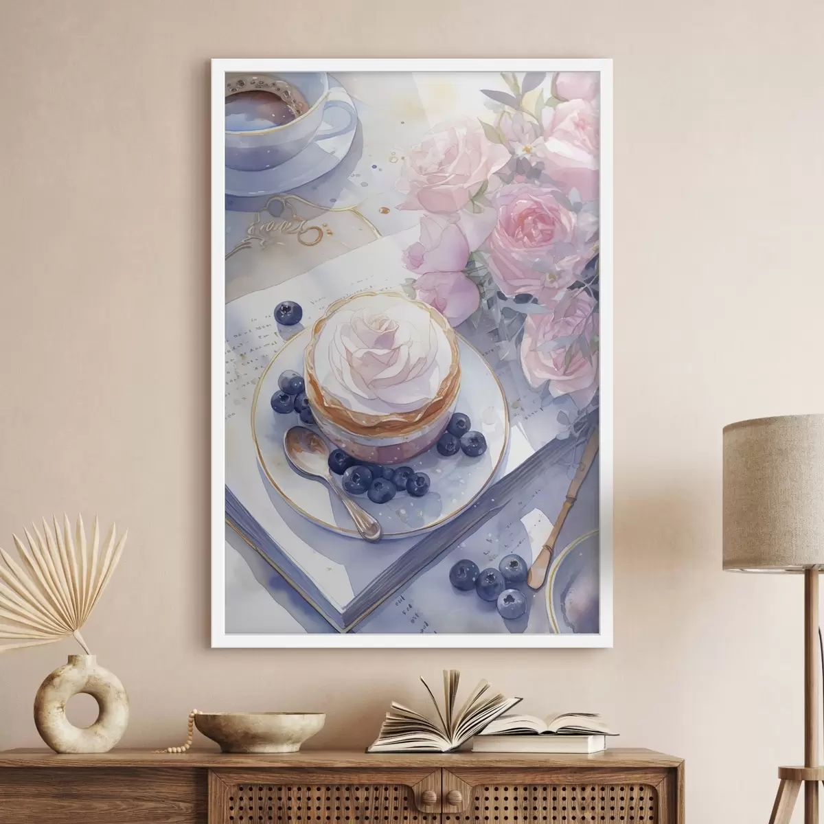 Plakat Mustika tassikook, boho stiil, akvarell, roosad roosid, poeetiline f43053