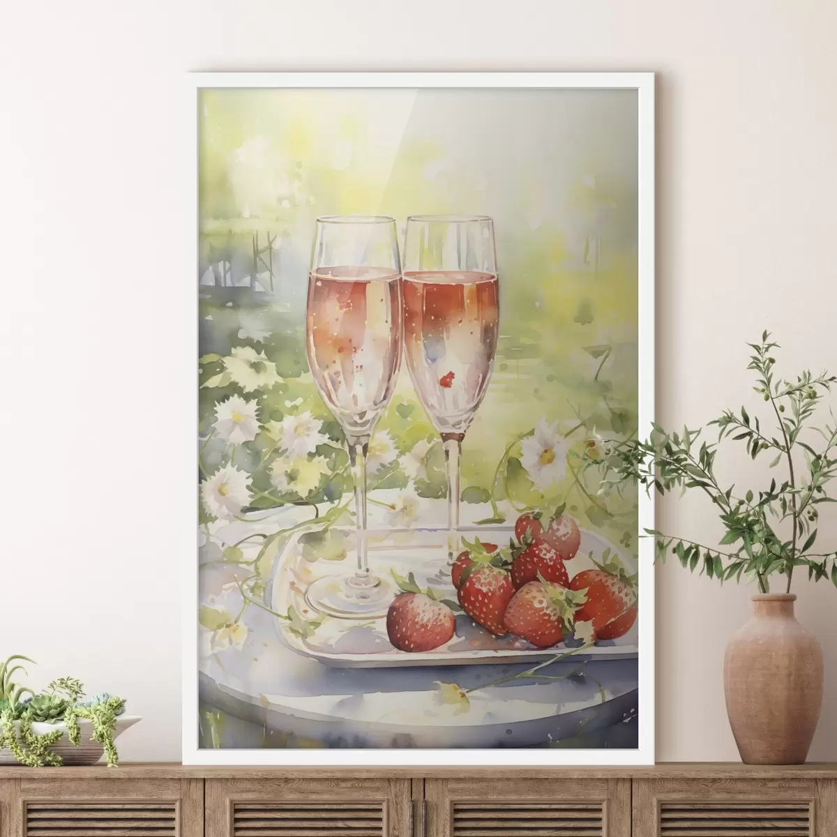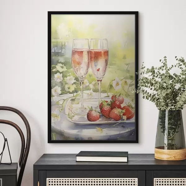 Poster Šampanjaklaaside, lillede ja maasikate akvarellistiilis joonistus Nr f43056