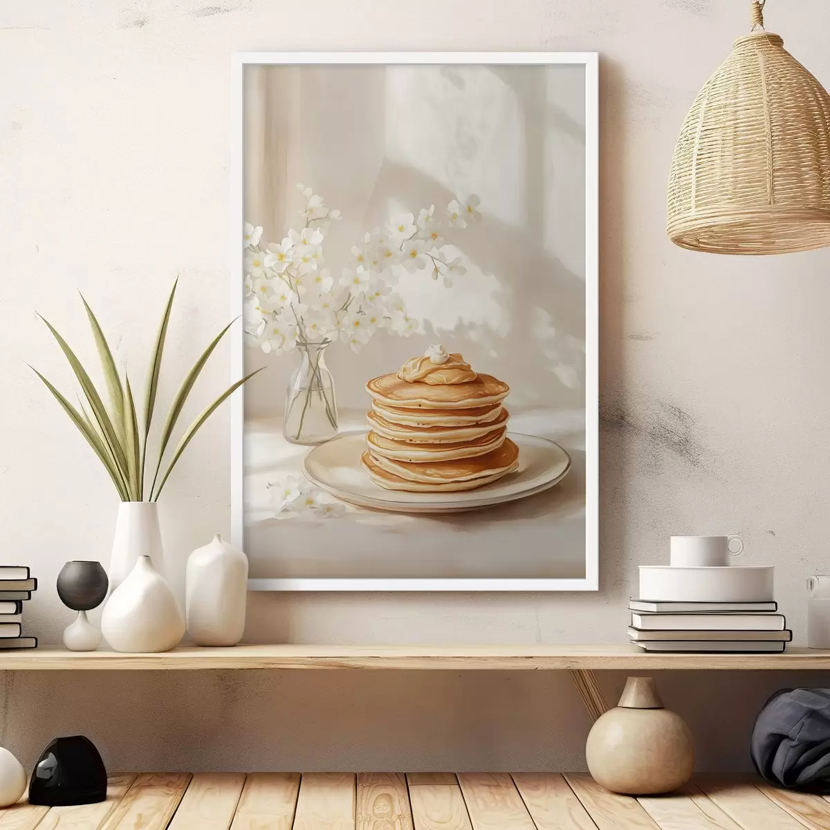 Poster Maitsvad pannkoogid maapähklivõiga, akvarellistiilis, vaas valgete lilledega Nr f43063