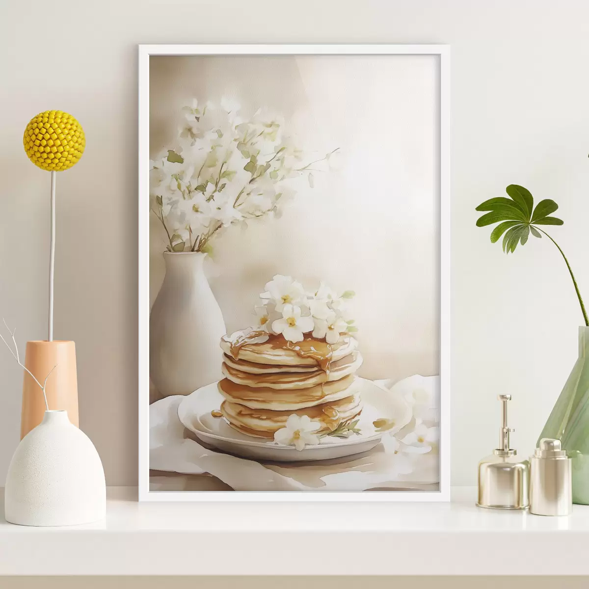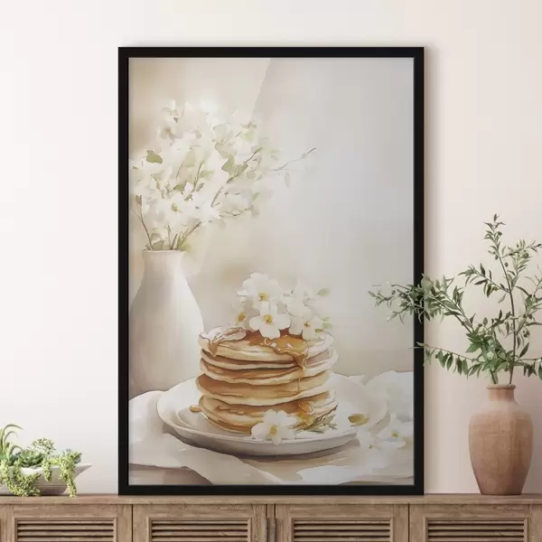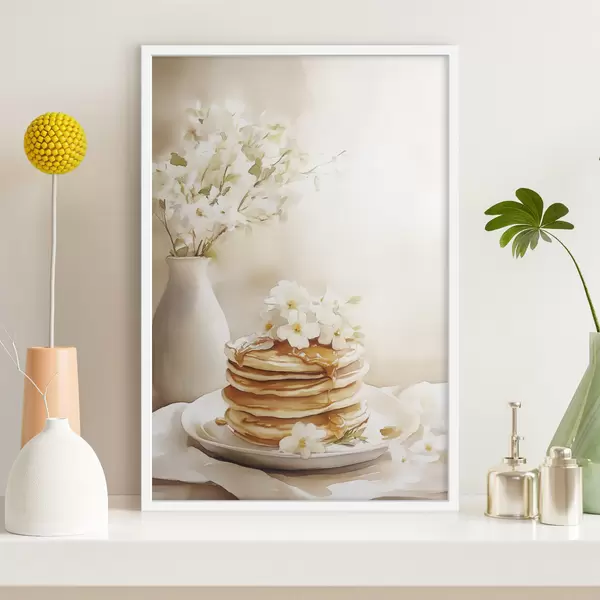 Poster Pannkoogid maapähklivõiga, valged lilled, akvarellistiilis joonistus Nr f43065