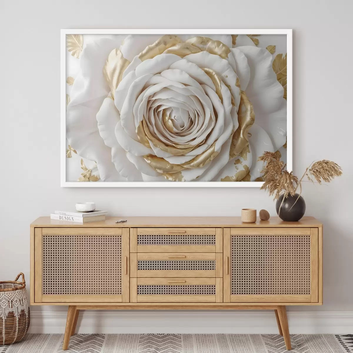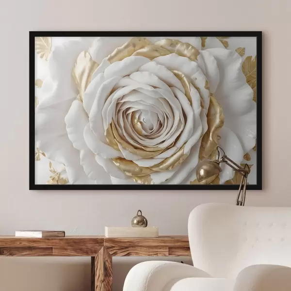 Plakat Valge minimalistlik dekoratiivne roos kollaste aktsentidega, kroonlehed on kihilised ja kumerad f43160