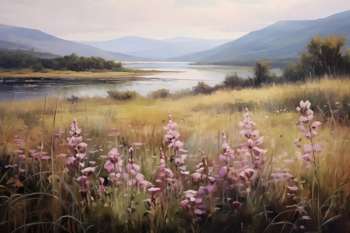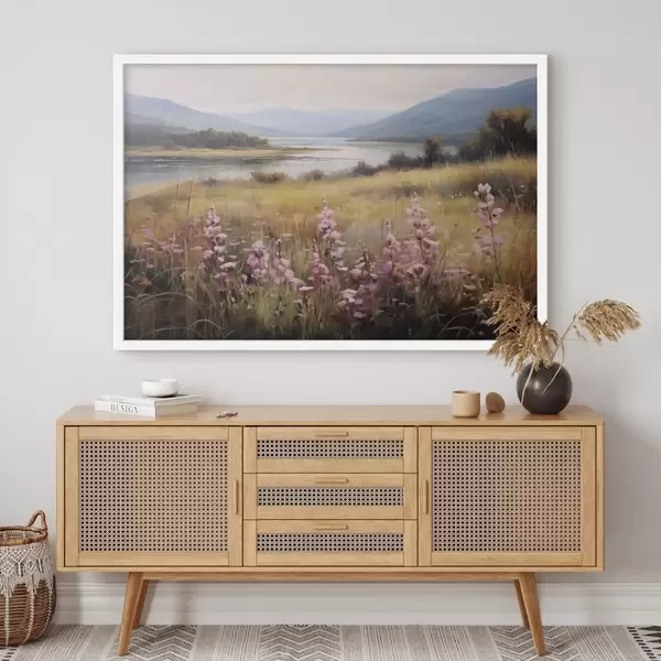 Poster Maastik roosade lillede põllu, järve ja mägedega taustal, pilvise taeva all Nr f43165