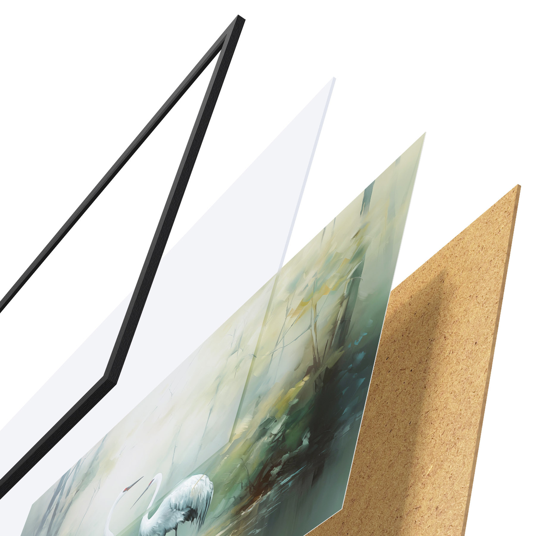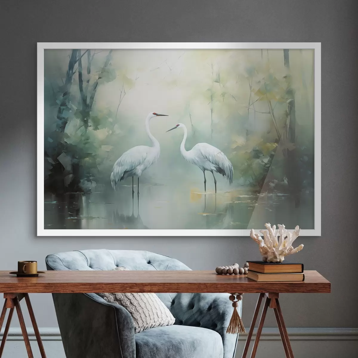 Poster Kaks valget kraanat seisavad tiigis, mida ümbritseb lopsakas roheline mets pehme hajutatud valgusega Nr f43166