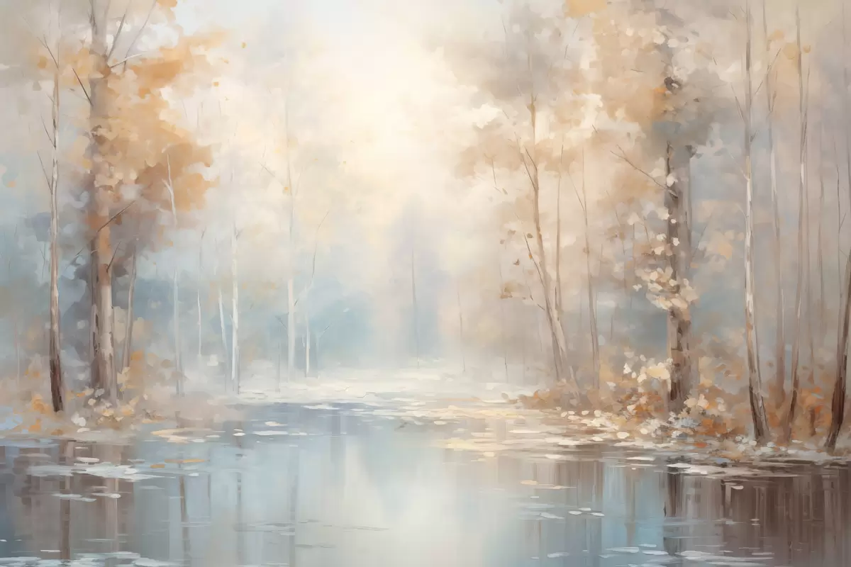 Poster Maastik õlimaal imitatsioon rahulikust jõest, mis peegeldab pehmet valgust, mida ümbritsevad sügisesed puud Nr f43167