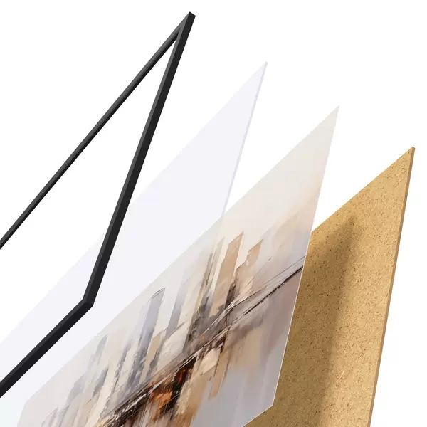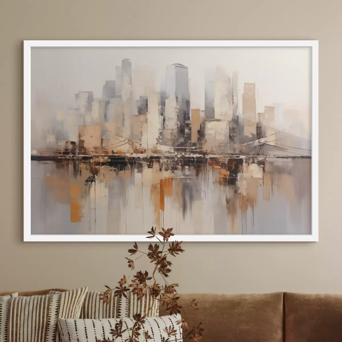 Poster Abstraktne linnapilt, kus kõrged hooned on pruunide, hallide ja valgete toonidega, mis peegelduvad allolevas vees Nr f43168