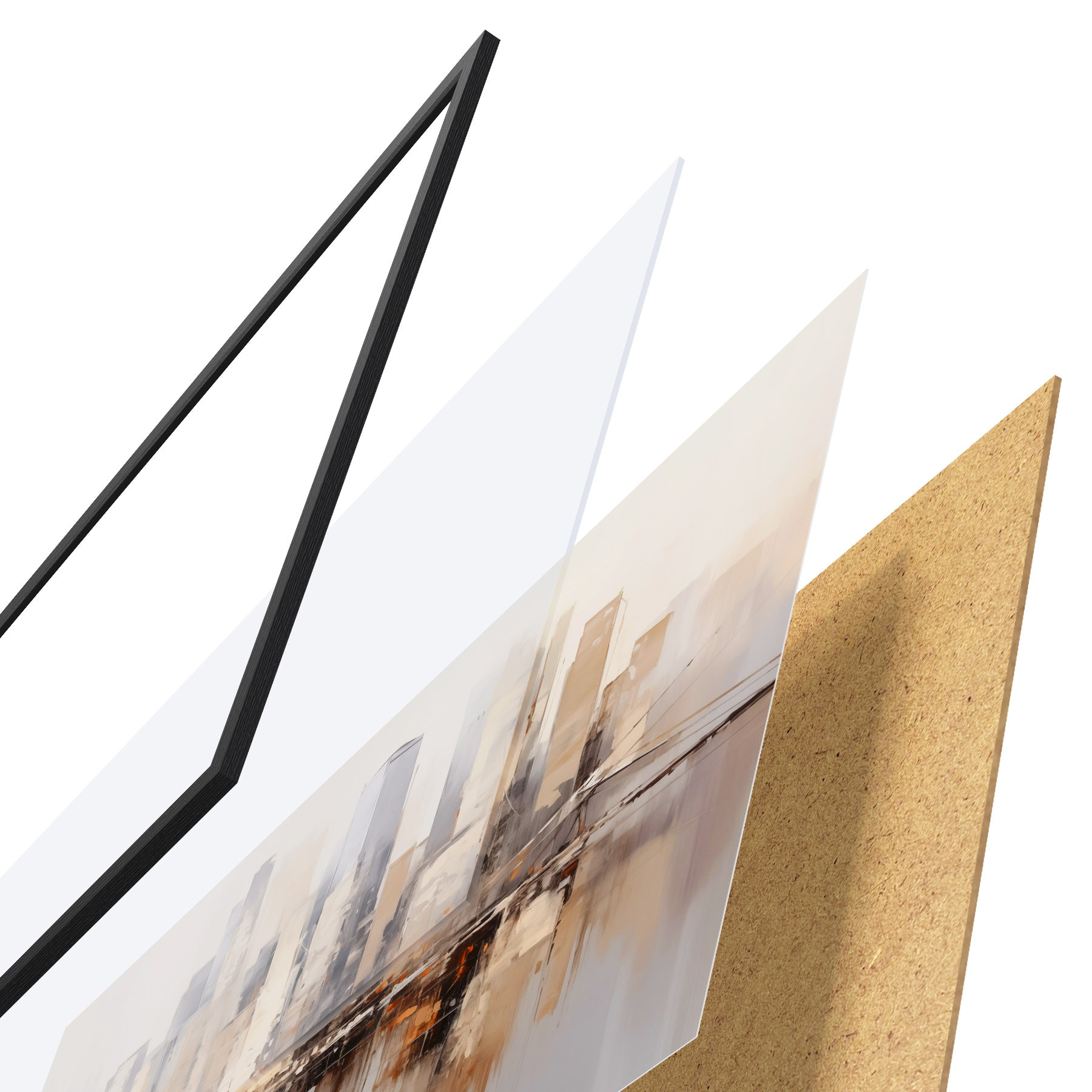 Plakat Abstraktne linnapilt, kus kõrged hooned on pruunide, hallide ja valgete toonidega, mis peegelduvad allolevas vees f43168