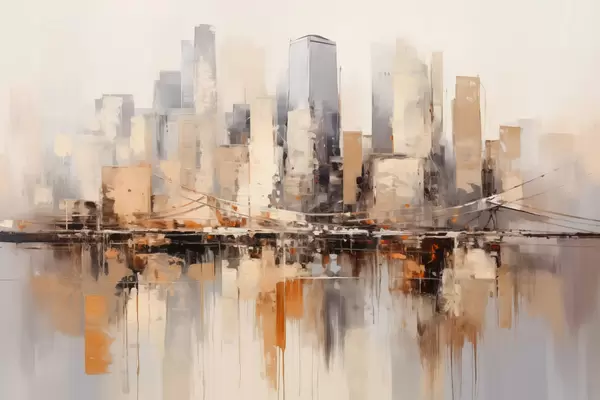 Poster Abstraktne linnapilt, kus kõrged hooned on pruunide, hallide ja valgete toonidega, mis peegelduvad allolevas vees Nr f43168