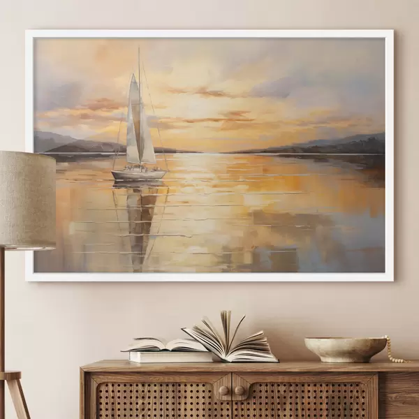 Plakat Maastikumaal koos purjekaga rahulikul merel, oranžikas ja kollane taevas, kauged mäed f43169