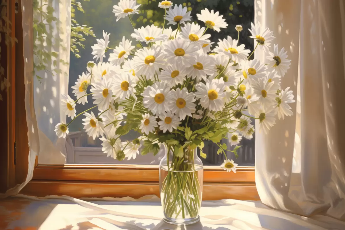 Poster Õlimaal imitatsioon vaasi valgeid marekad aknalaual, päikesepaisteline päev, soojad värvid palett Nr f43171