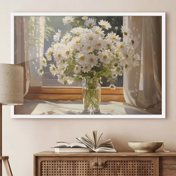 Plakat Õlimaal imitatsioon vaasi valgeid marekad aknalaual, päikesepaisteline päev, soojad värvid palett f43171