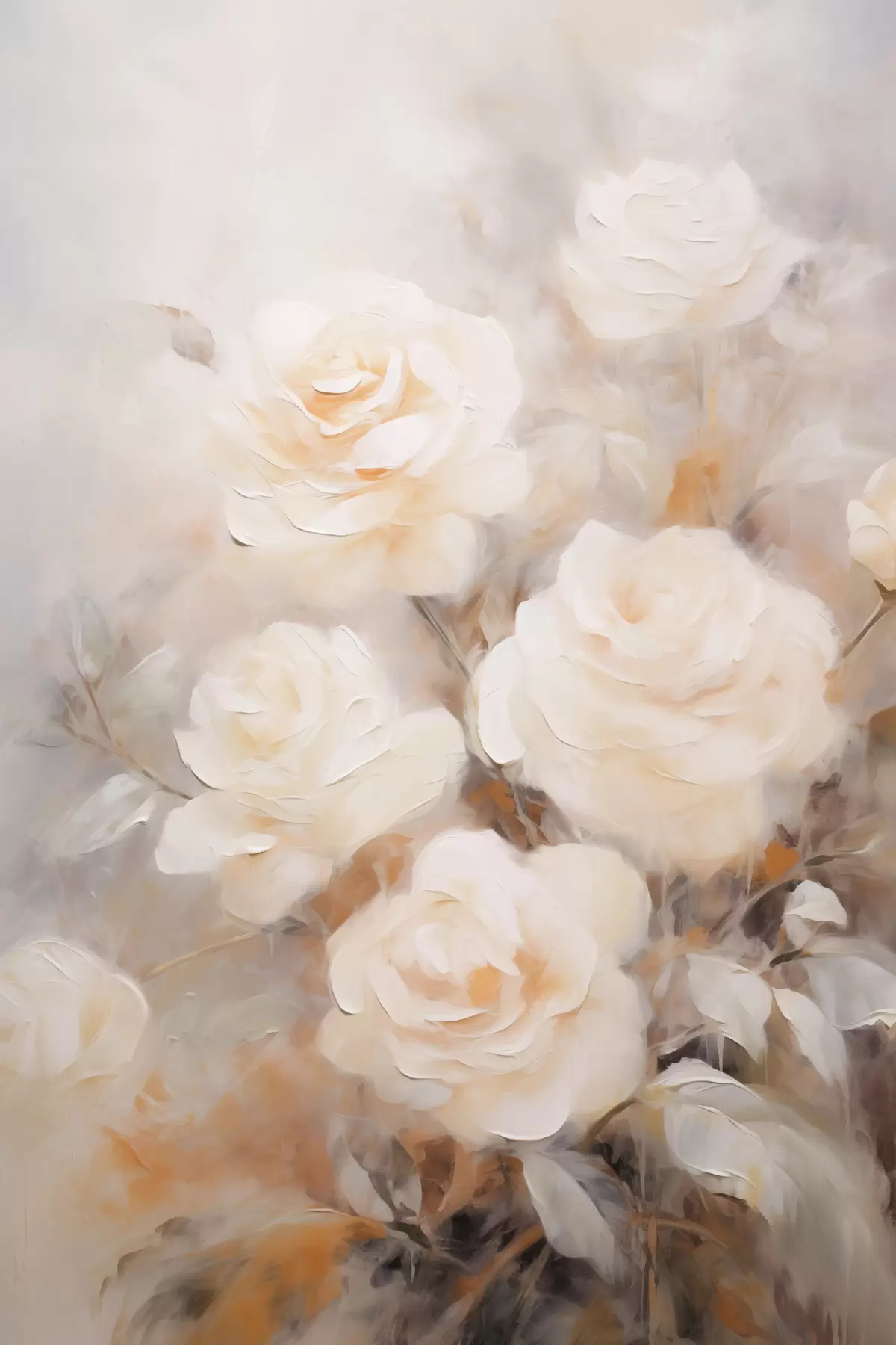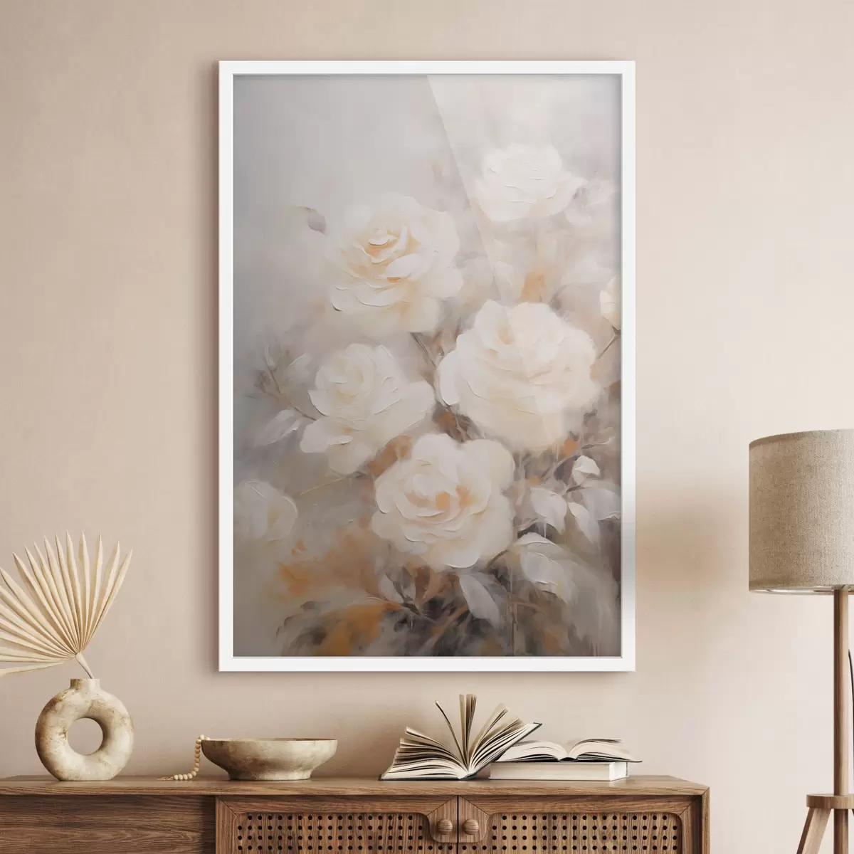 Plakat Valged roosid pehmete kroonlehtedega, taustaks vaiksed värvid ja hägused kujundid, mis loovad unenäolise efekti f43177