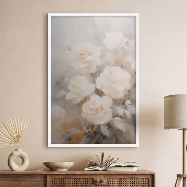 Poster Valged roosid pehmete kroonlehtedega, taustaks vaiksed värvid ja hägused kujundid, mis loovad unenäolise efekti Nr f43177