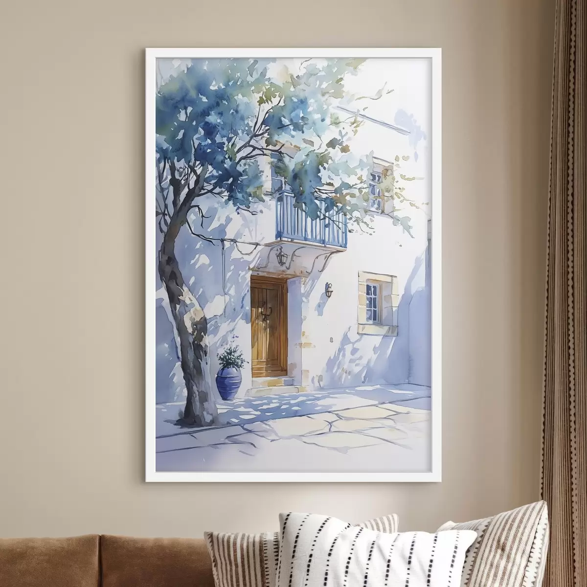 Plakat Akvarellstiil, kreeka maja, õitsev puu, arhitektuur f43182