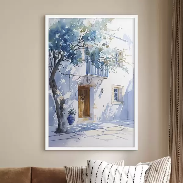 Poster Akvarellstiil, kreeka maja, õitsev puu, arhitektuur Nr f43182