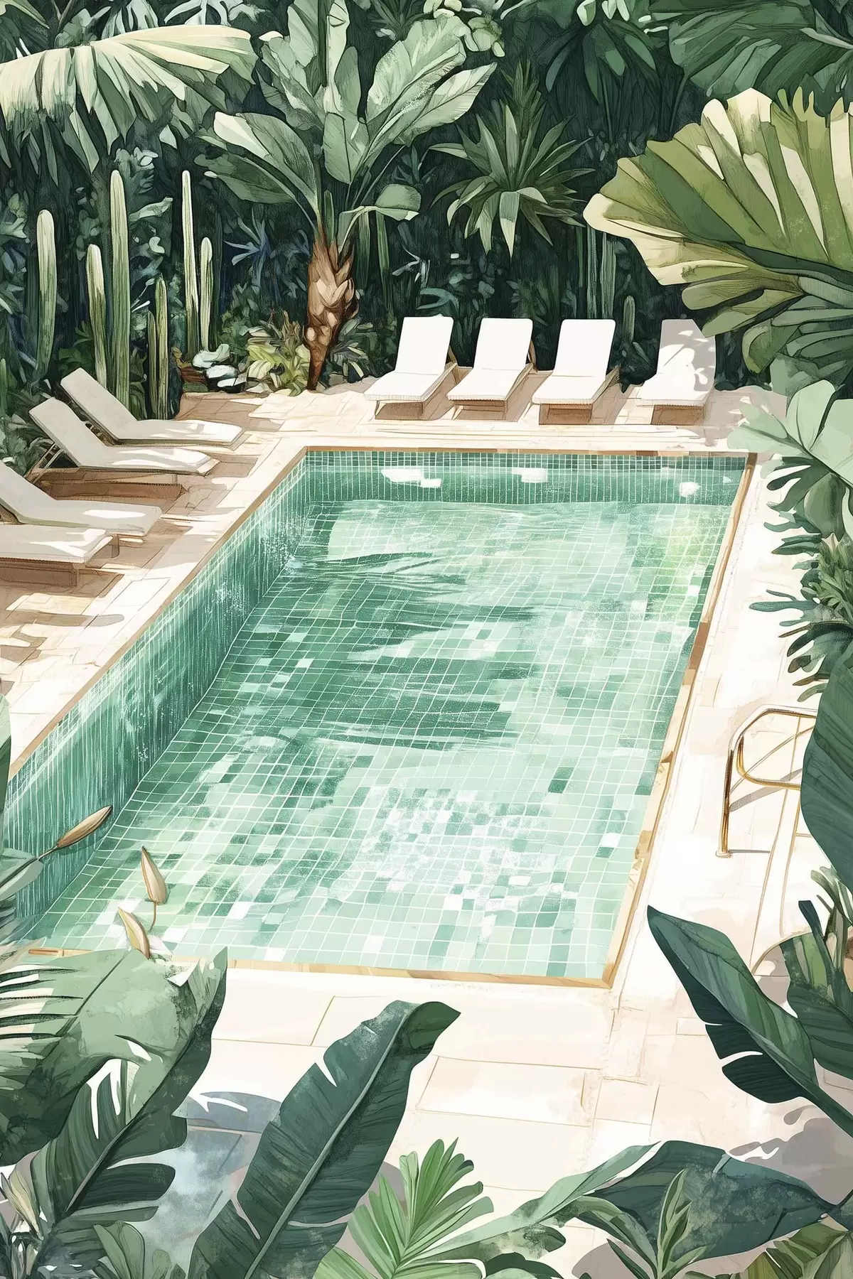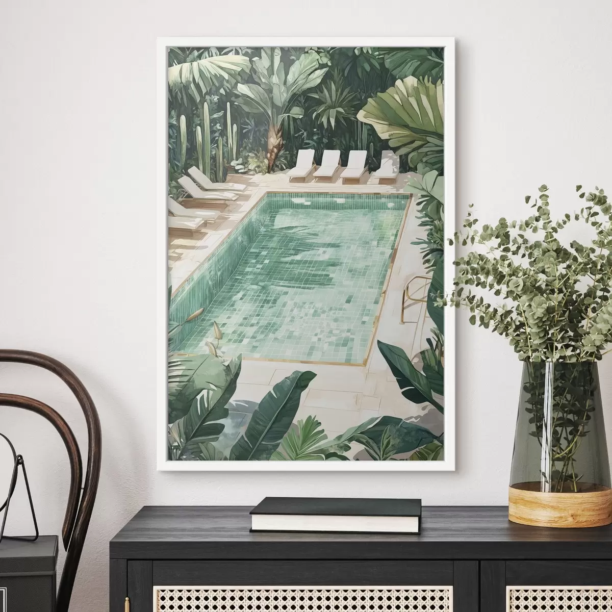 Plakat Suvine bassein rohelises aias, vintage stiilis, akvarell f43189