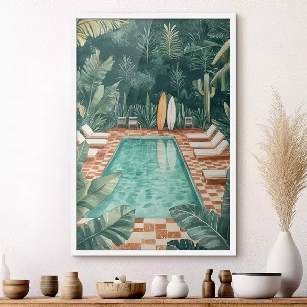 Poster Vintage suvine bassein, troopiline mets, rohelus, palmipuud, akvarellstiilis Nr f43191