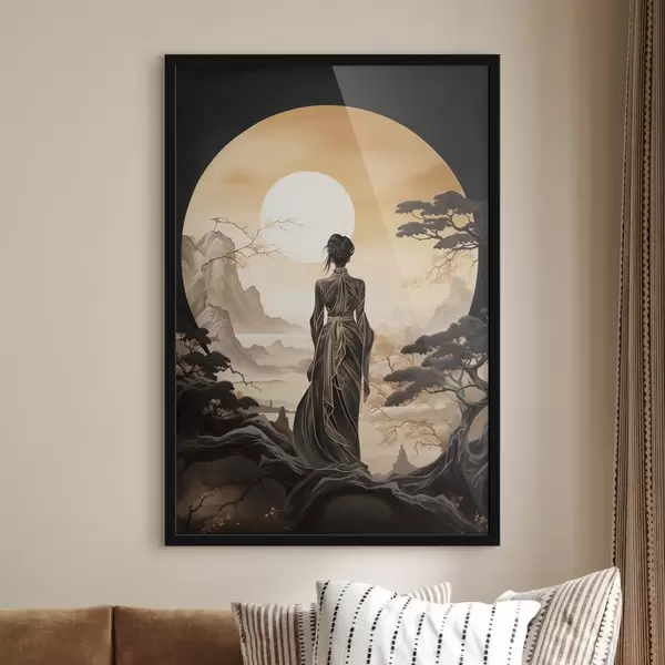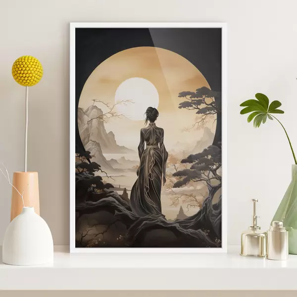 Plakat Inimesed, Jaapan, tüdruk päikeseloojangul sakura ja mägede taustal f43256