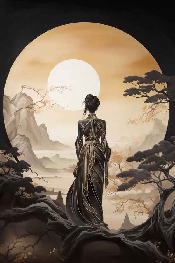 Plakat Inimesed, Jaapan, tüdruk päikeseloojangul sakura ja mägede taustal f43256