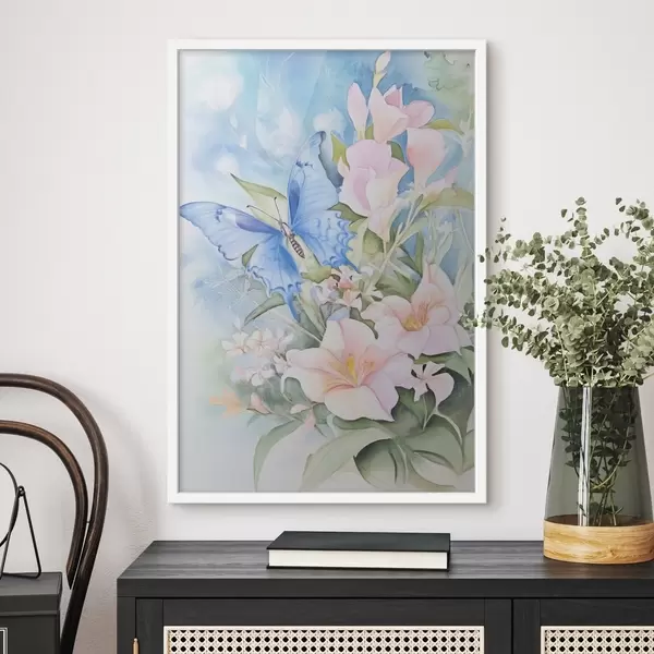 Poster Sinine liblikas ja roosad lilled Nr f43296