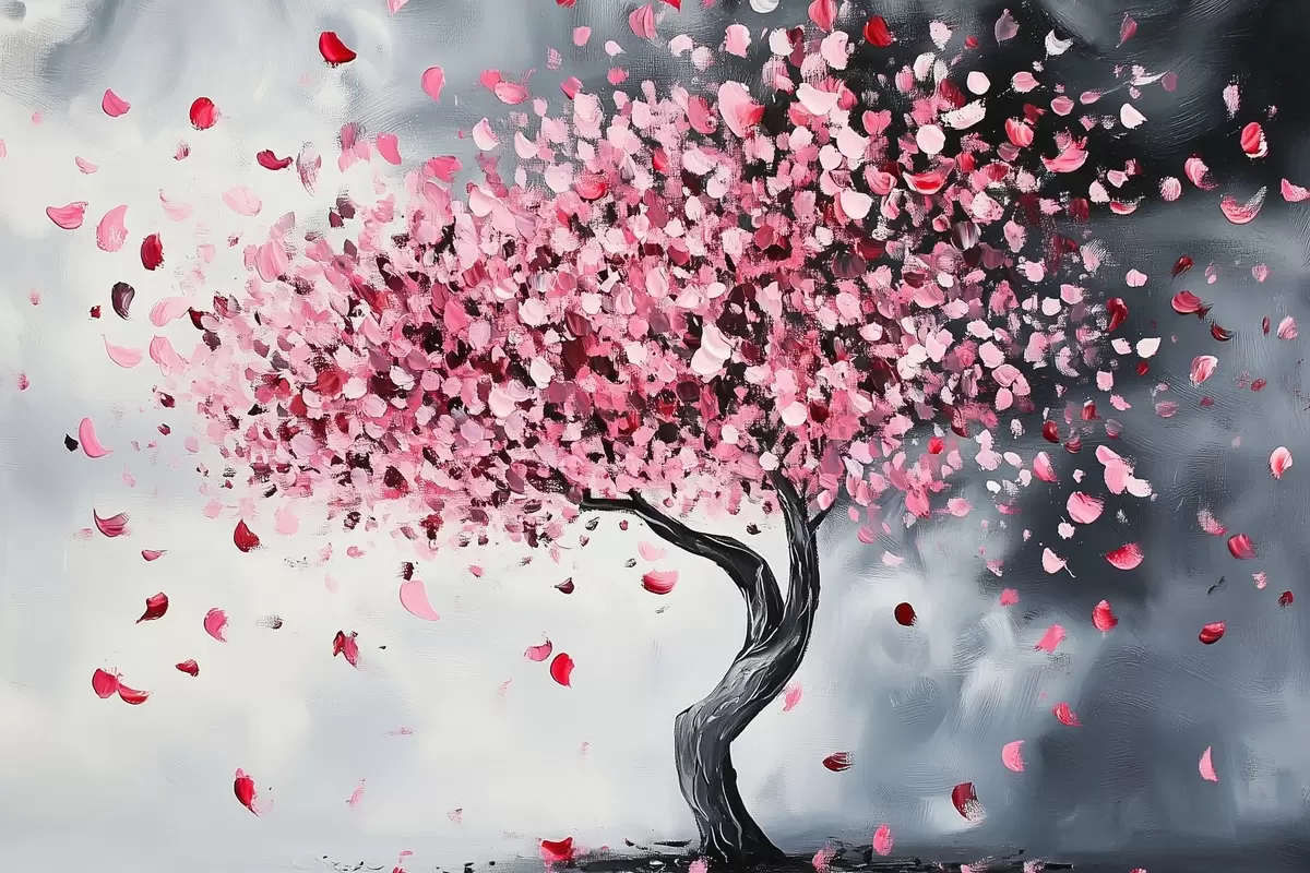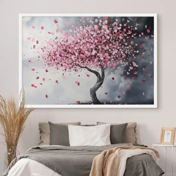 Plakat Roosa õitsev puu hallil taustal f43299