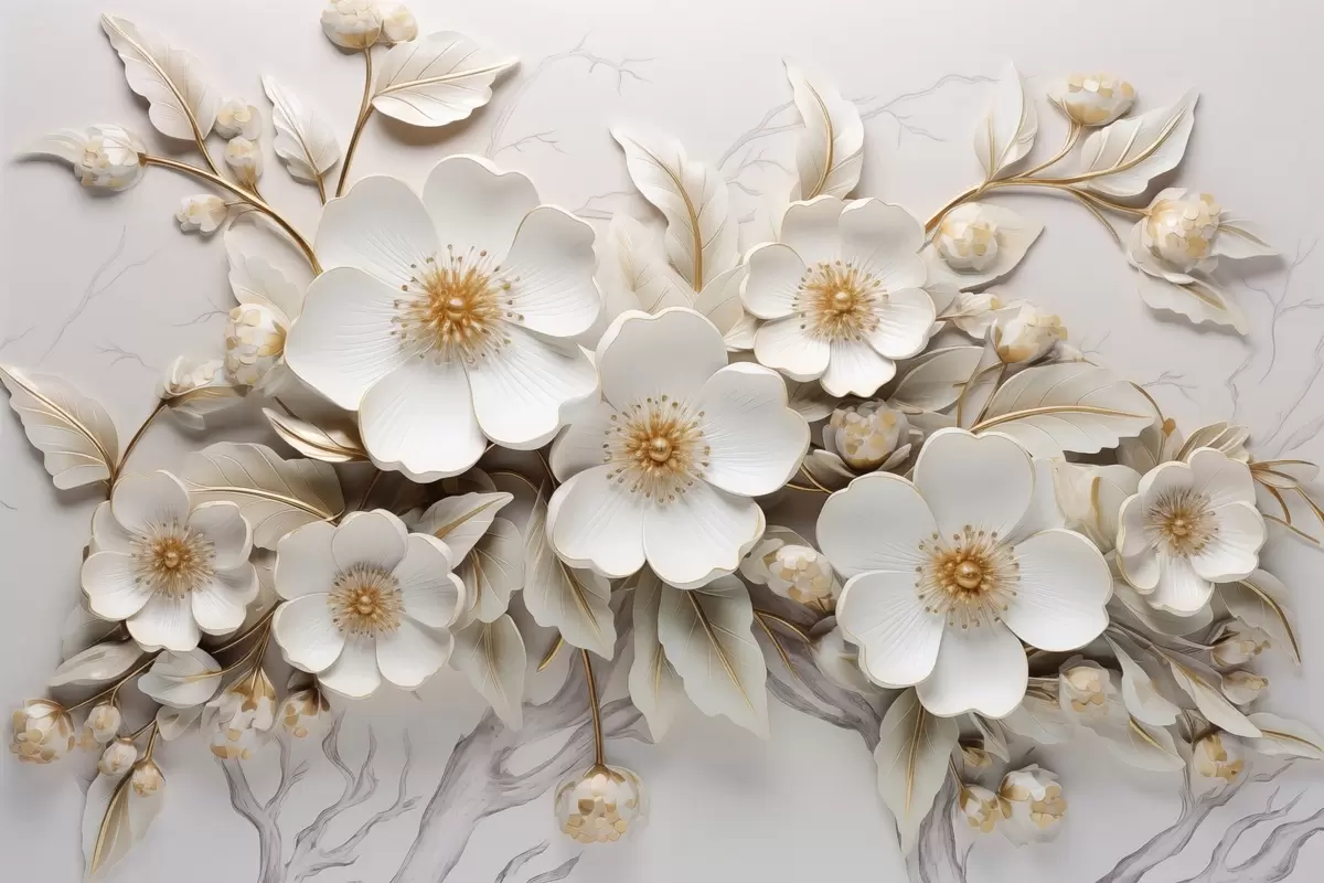 Plakat 3D valged lilled klassikalises stiilis kollase aktsendiga f43313