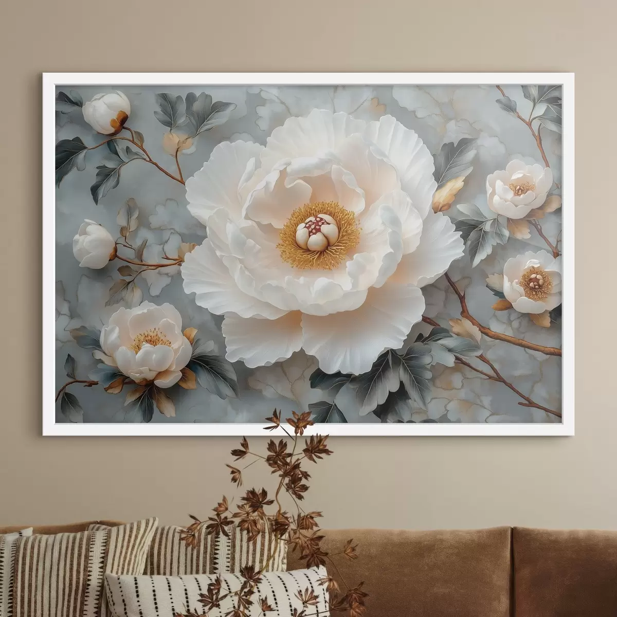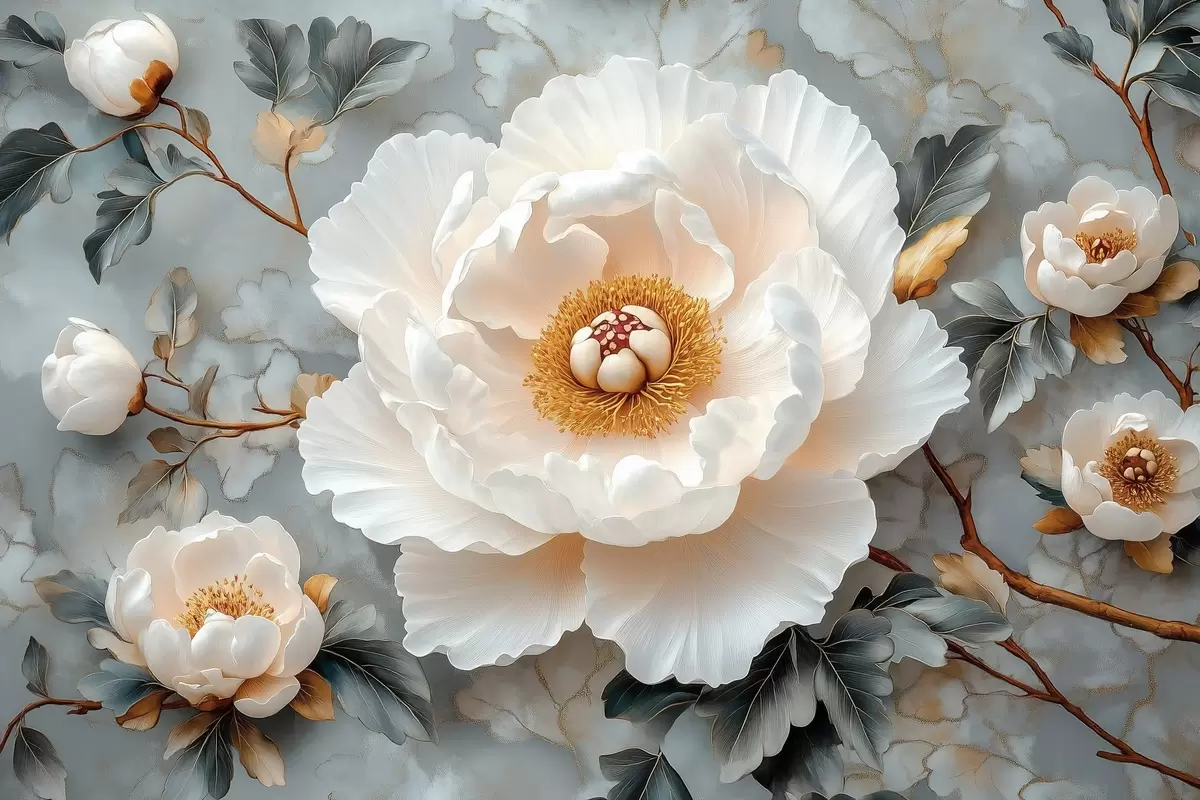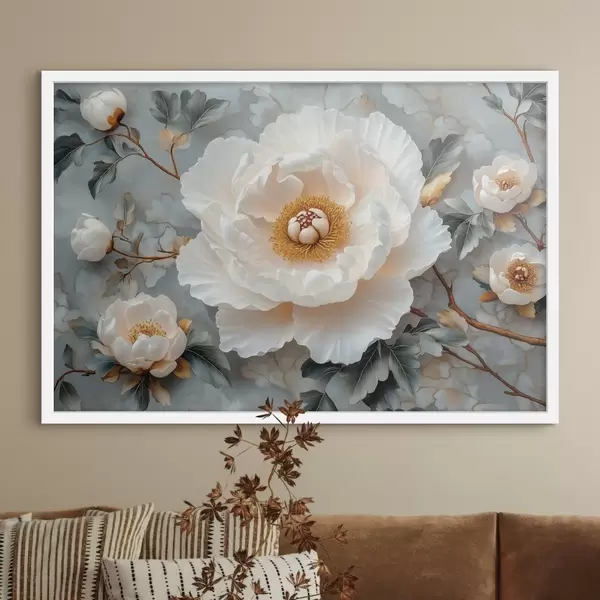 Plakat Suurepärane pioon lehtede ja väikeste pojengide taustal f43315