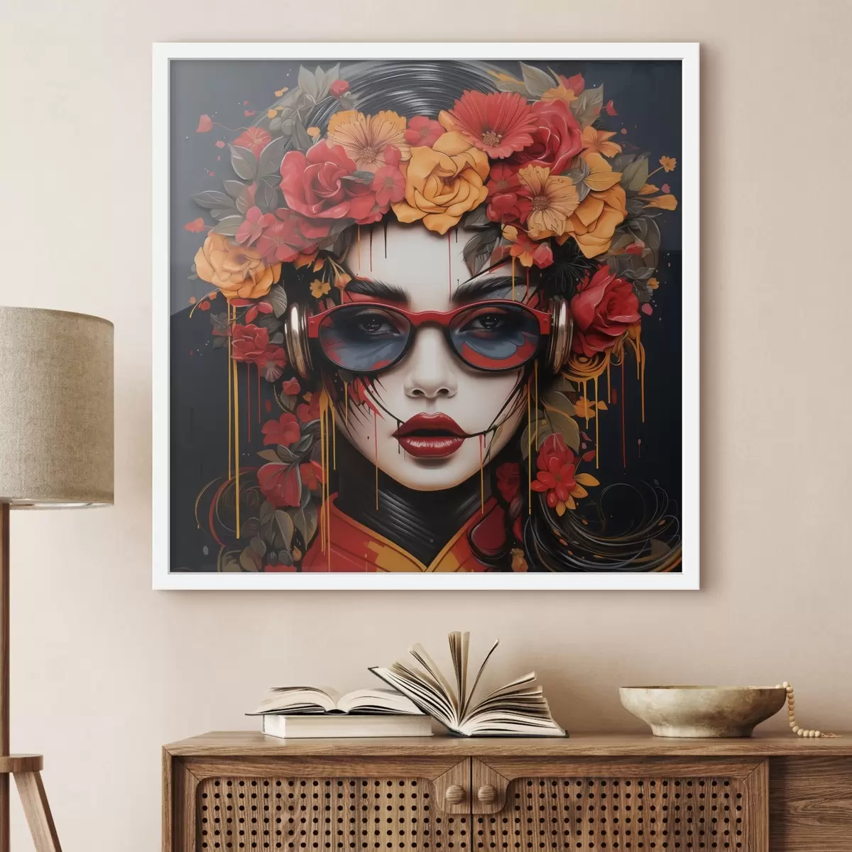 Poster Naine lilledega peas, tänavakunsti stiilis Nr f43362